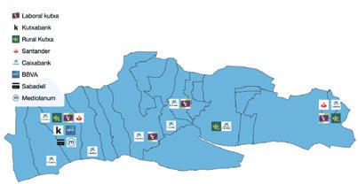 Sakanan dauden bulegoen ia 3/4 hiru entitatek betetzen dute: Caixabank, Laboral Kutxa eta Rural Kutxa.