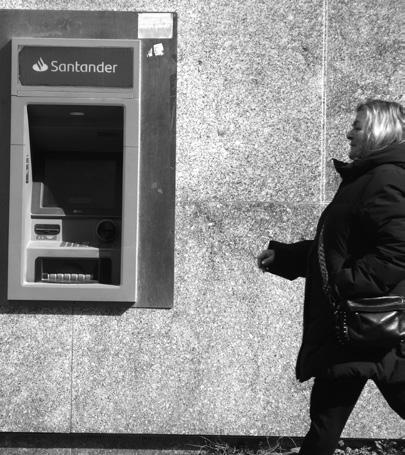 Emakumezkoa Irurtzungo kutxazain baten aldamenetik pasatzen.