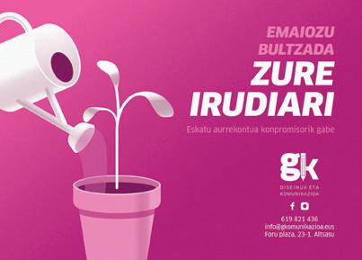 Maketatzailea: Iune Trecet Obeso maketazioa@guaixe.eus GK diseinu zerbitzua: Ainara Santiago Langarika info@gkomunikazioa.eus 619 821 436 Ainhoa Etxeberria Pikabea gk@gkomunikazioa.eus Administrazioa: Gema Lakuntza Lopez admin@guaixe.eus Zuzentzailea: Joxe Aldasoro Jauregi