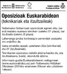 gi edo gisakoetan parte hartu duten herritarrei dirulaguntza emateko deialdia zabaldu du. Joan zen urteko azaroaren 1etik aurtengo abenduaren 31ra bitarteko ikastaroen matrikulak. Beti ere, edozein gairi buruz euskaraz egindakoak badira, aisialdiko monitore edo zuzendari izateko euskarazko ikastaroak barne. Horiez aparte, euskararen edota hizkuntza gutxituen normalizazioarekin edo soziolinguistikarekin zerikusia dutenak ere lagunduko ditu. Laguntzatik kanpo geldituko dira egoitza eta kilometraje gastuak. Euskara Zerbitzuak jakinarazi duenez, aurtengo abenduaren 31rako bukatuta ez dauden ikastaroen kasuan, gutxienez %80ko asistentzia eskatuko die parte hartzaileei data horretarako. Deialdiari buruzko informazio guztia sakana-mank.eus webgunean. Sakanako Mintzakide taldeak: Altsasun astelehenetan 10:00etan liburutegian, ostegunetan 20:00etan Lezea tabernan eta ostiraletan 9:00etan Kaixo tabernan, Ziordian ostiraletan, 17:00etan liburutegian, Etxarri Aranatzen ostiraletan 19:00etan Xapatero tabernan, Arbizun astearteetan 16:30ean kiroldegiko tabernan, Lakuntzan asteazkenetan 18:15ean jubilatu elkartean eta Irurtzunen astelehenetan 18:30ean Iratxo tabernan, ostegunetan 9:00etan Pikuxarren eta ostiraletan 19:00etan Pikuxarren ere. Parte hartzeko deitu 600 482 024 telefonora. SOS GAZA. Gernika-Palestina herri ekimenak Yala Nafarroa plataformarekin batera Elkartasun Aktiboa iniziatiba martxan jarri du: Netan-
