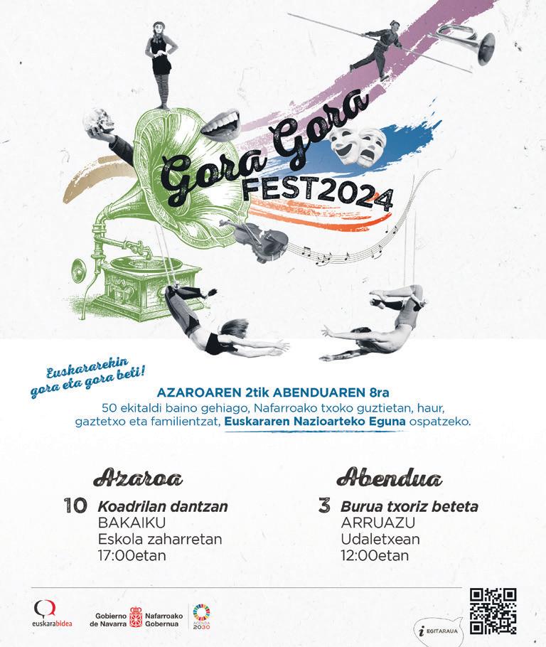 Nazioarteko Eguna da, eta Euskarabideak Euskararen Nafar Institutuak Gora Gora Fest! 2024 euskarazko kultur zikloaren laugarren edizioa antolatu du. Azaroaren 2tik abenduaren 8ra, Nafarroako 55 herritan izanen dira jarduerak, tartean Bakaikun, azaroaren 10ean, eta Arruazun, abenduaren 3an. Programan bederatzi jarduera daude: an -