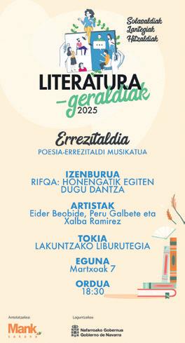 Eneida C. M. eta Erkuden R. B. laKUNtZa Rifqa: Honengatik egiten dugu dantza poesia errezitaldi musikatua izanen da martxoaren 7an, ostirala, 18:30ean, Lakuntzako liburutegian, Sakanako Mankomunitateak Baztango Udalarekin, Bortzirietako Euskara Mankomunitatearekin eta Nafarroako Iparraldeko Euskara Mankomunitatearekin batera antolatzen duen 2025eko Literatura Geraldiak egitasmoaren barruan. Eider Beobidek, Peru Galbetek eta Xalba Ramirezek emanen