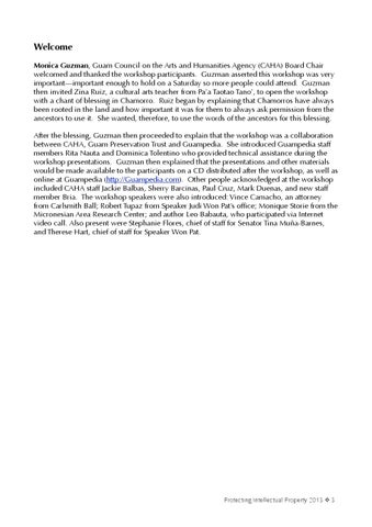 Welcome Monica Guzman, Guam Council on the Arts and Humanities Agency (CAHA) Board Chair welcomed and thanked the workshop participants. Guzman asserted this workshop was very important—important enough to hold on a Saturday so more people could attend. Guzman then invited Zina Ruiz, a cultural arts teacher from Pa’a Taotao Tano’, to open the workshop with a chant of blessing in Chamorro. Ruiz began by explaining that Chamorros have always been rooted in the land and how important it was for them to always ask permission from the ancestors to use it. She wanted, therefore, to use the words of the ancestors for this blessing. After the blessing, Guzman then proceeded to explain that the workshop was a collaboration between CAHA, Guam Preservation Trust and Guampedia. She introduced Guampedia staff members Rita Nauta and Dominica Tolentino who provided technical assistance during the workshop presentations. Guzman then explained that the presentations and other materials would be made available to the participants on a CD distributed after the workshop, as well as online at Guampedia (http://Guampedia.com). Other people acknowledged at the workshop included CAHA staff Jackie Balbas, Sherry Barcinas, Paul Cruz, Mark Duenas, and new staff member Bria. The workshop speakers were also introduced: Vince Camacho, an attorney from Carlsmith Ball; Robert Tupaz from Speaker Judi Won Pat’s office; Monique Storie from the Micronesian Area Research Center; and author Leo Babauta, who participated via Internet video call. Also present were Stephanie Flores, chief of staff for Senator Tina Muña-Barnes, and Therese Hart, chief of staff for Speaker Won Pat.