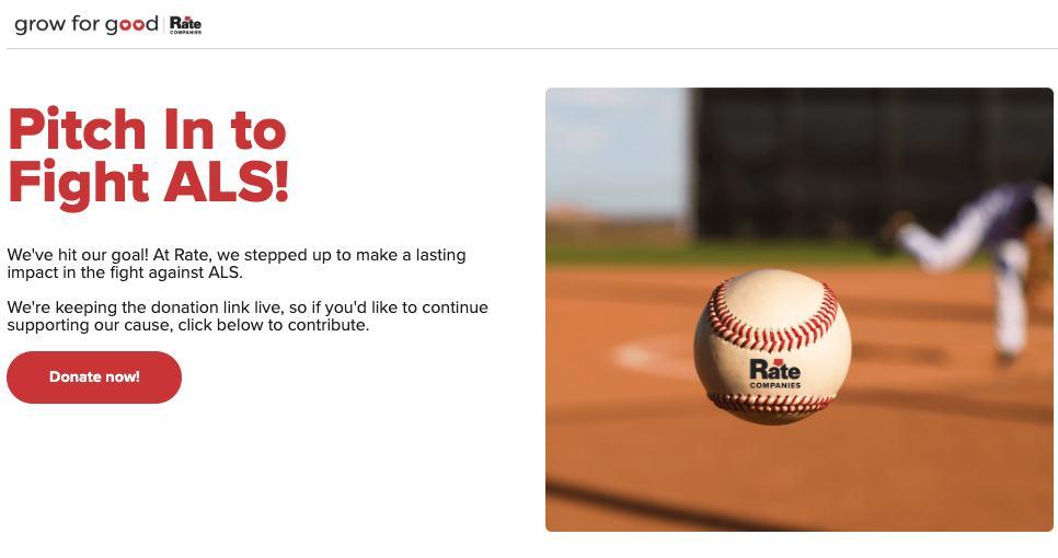 The Pitch In to Fight ALS fundraiser was a 5-day effort which united Rate employees, partners and community in a shared mission to support six nonprofits in ALS research and resources. Through engaging social initiatives, we raised over $1 million dollars to fight ALS, exceeding our initial fundraiser amount and creating hope for a future without ALS.