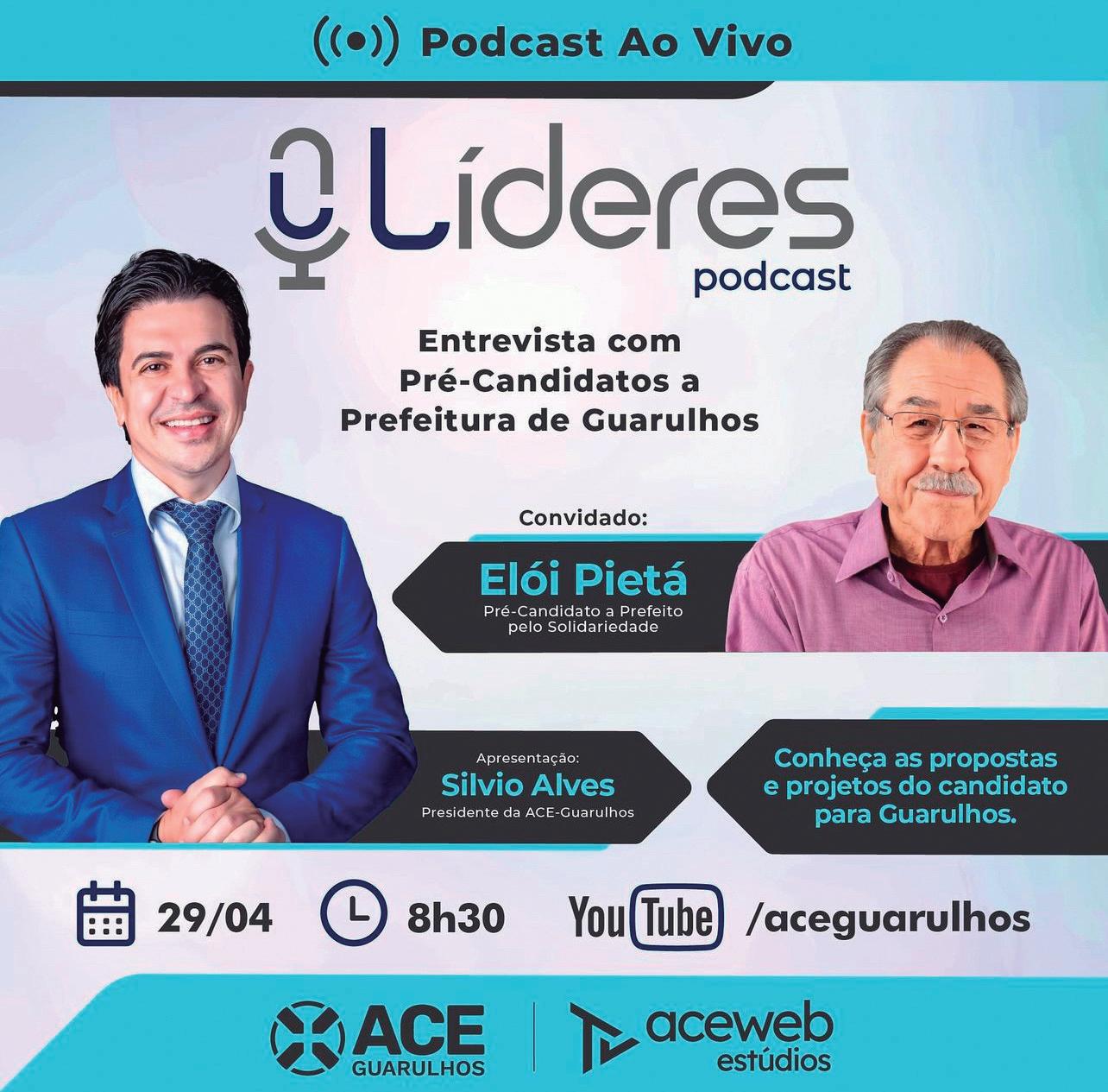 A Associação Comercial e Empresarial de Guarulhos vai entrevistar os pré-candidatos a prefeito da cidade nas eleições deste ano. Os encontros serão ao vivo, no “Líderes Podcast”, apresentado pelo presidente da entidade, Silvio Alves, e transmitido pelo canal da ACE no Youtube.