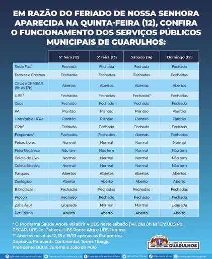 A Prefeitura de Guarulhos informa que em razão do feriado de Nossa Senhora Apa-