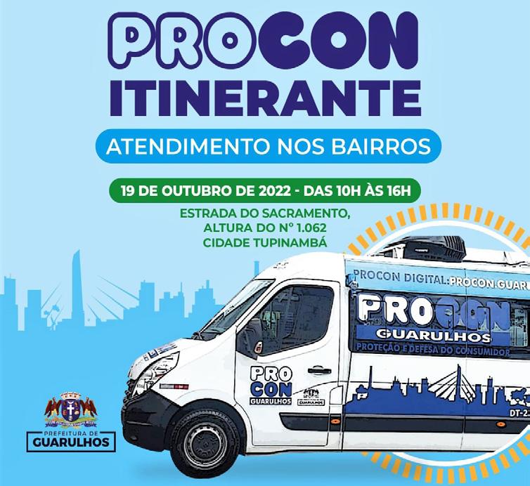 A unidade volante do Pro con Guarulhos estará na pró xima quarta-feira (19) na Ci dade Tupinambá (estrada do Sacramento, altura do número 1.062), das 10h às 16h, para atender a população. Todas as quartas-feiras o veículo da Co ordenadoria de Defesa e Proteção do Consumidor vai a um bairro diferente do município e disponibiliza os mesmos servi ços executados nos postos fi xos do Procon.