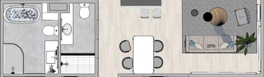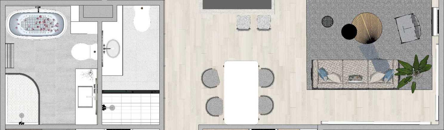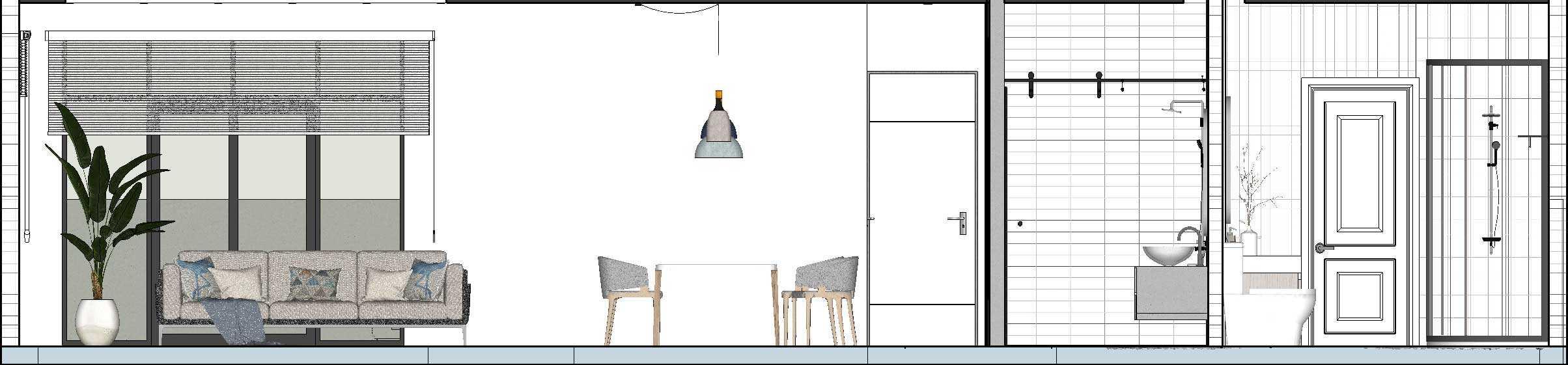 In terms of layout, the public bathroom is adjacent to the dining room and kitchen. In order to reduce the presence of the bathroom, the door of it is planned as a hidden sliding door without a handle.