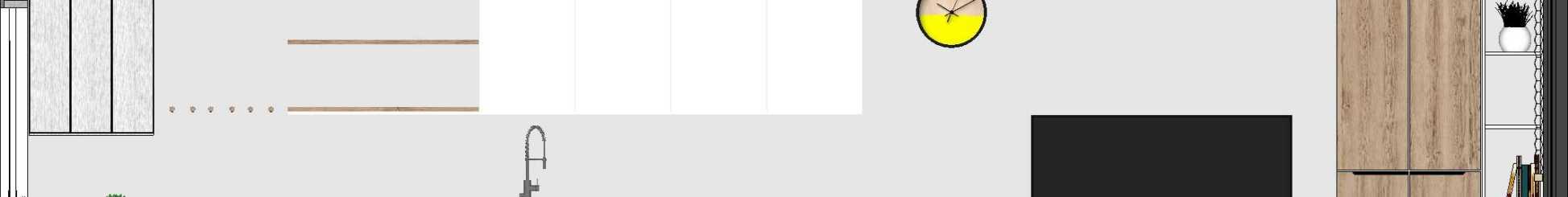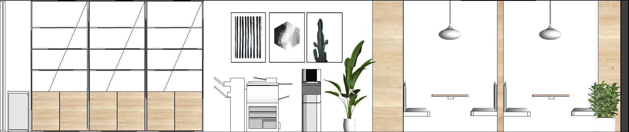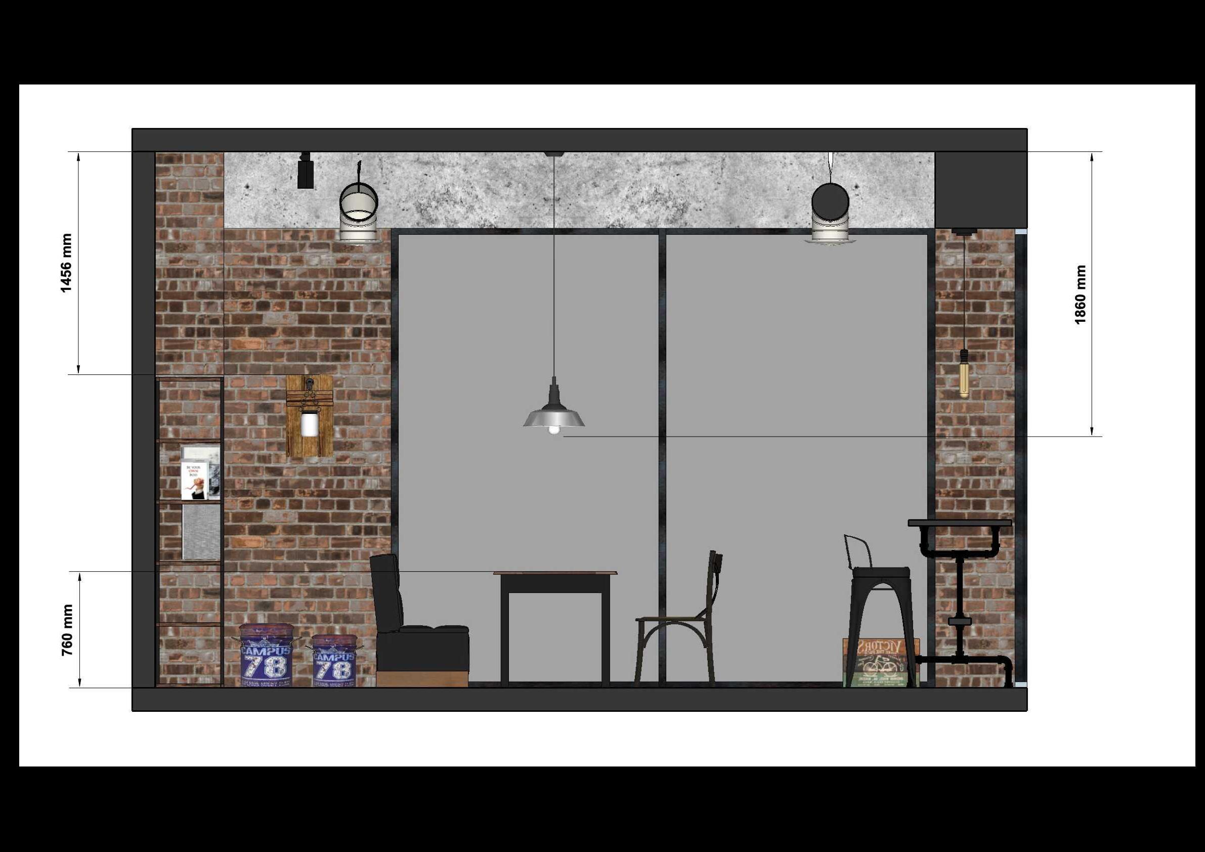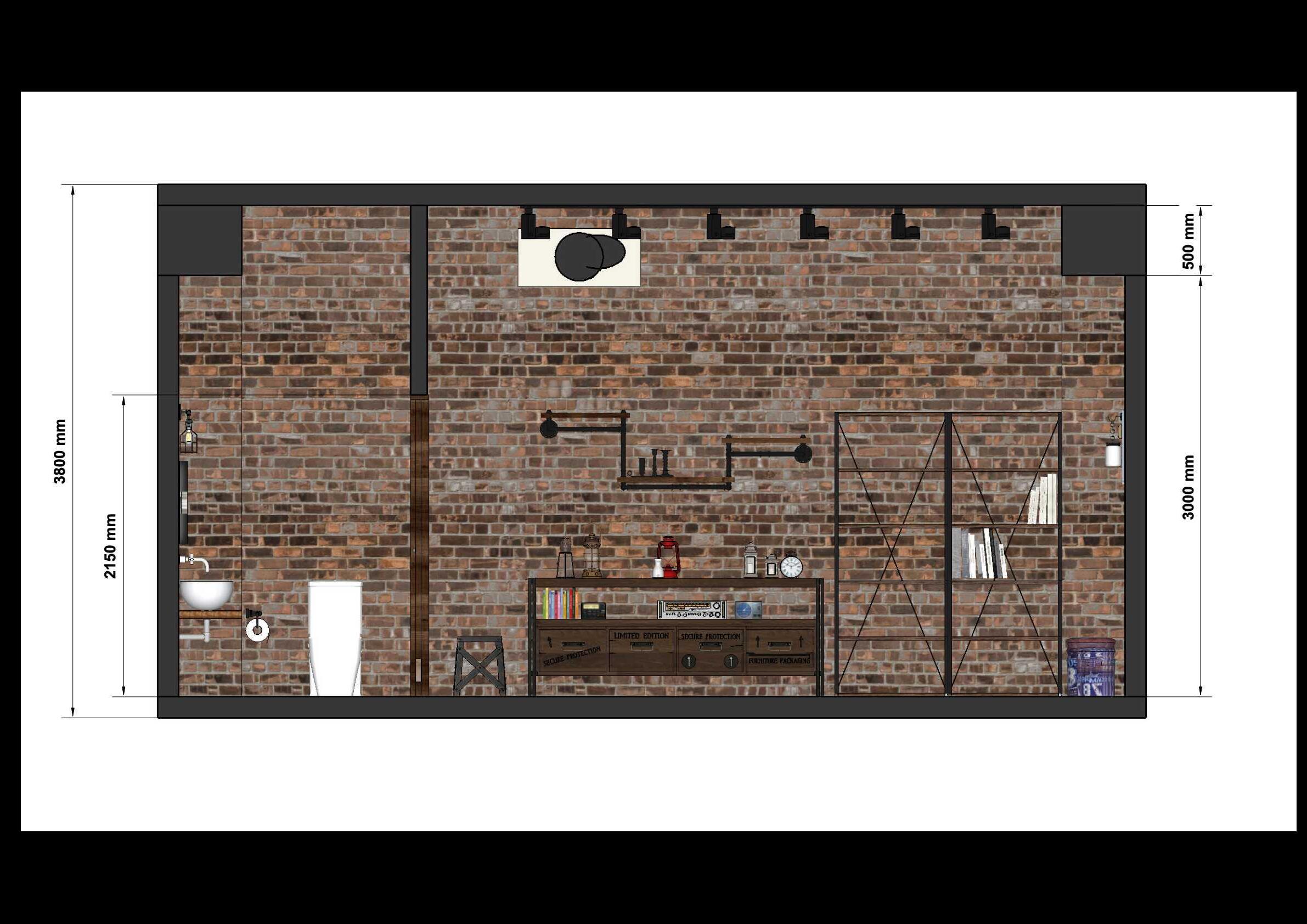 The total height of the interior area is 3500mm. The length of the beam is 500mm from the ceiling. The east side wall as the extended space would be built of red bricks with exposed surfaces. In order to look visually neat, the top of the storage shelves and the shelf panels, as well as the wall lamp on the right need to be aligned.
