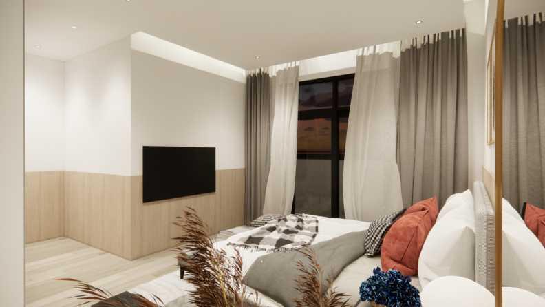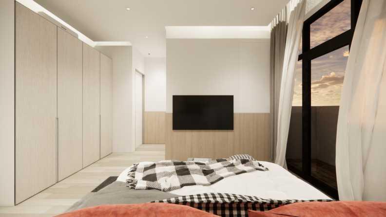 The wall plan of the master bedroom is 1200mm high maple plank from the ground, providing a warmer tone, except for the wall of the walk-in closet.