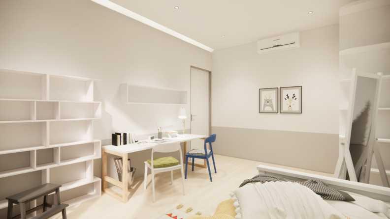 Since children's things have more colors, the furniture will be matched with light wood grain and grayscale, and the desk will be selected in a wider one for the companion of parents.