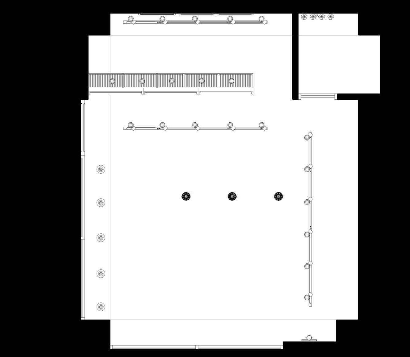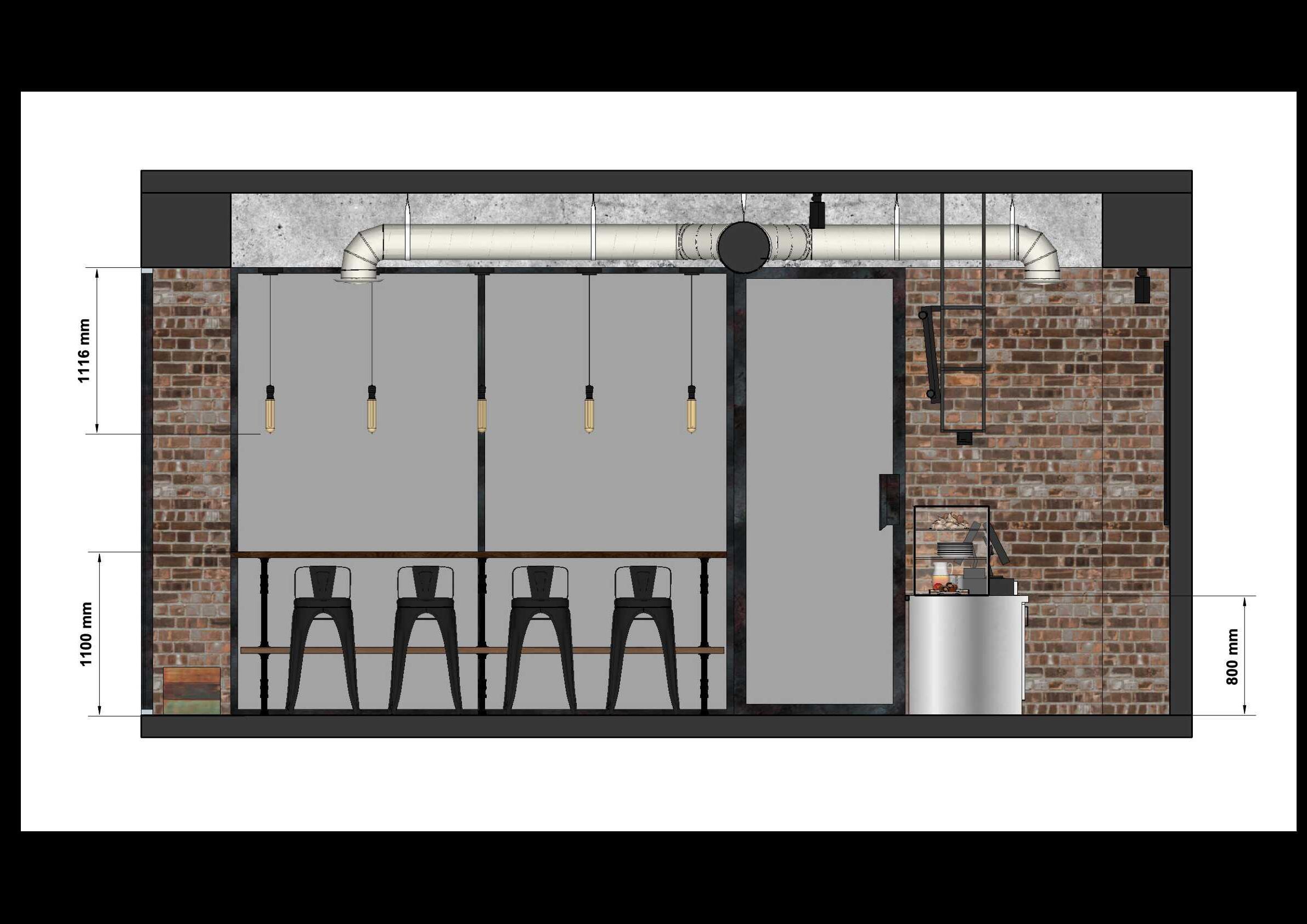 Maintain the west side wall then swap the original entrance with the floor-to-ceiling window. The height of the bar facing the floor-to-ceiling window is 1100mm. Install tungsten filament chandeliers above the bar. The bottom of the chandelier to the beam above it is 1116mm. Set four tables and five chandeliers in this area. To avoid the shadow caused by the customers during the meal, I arrange the tables and the chandeliers in stagger. Because the space for the bar and the counter is quite small, I hang the shelves above the counter to make more space for the employees. Let them work comfortably and safely.