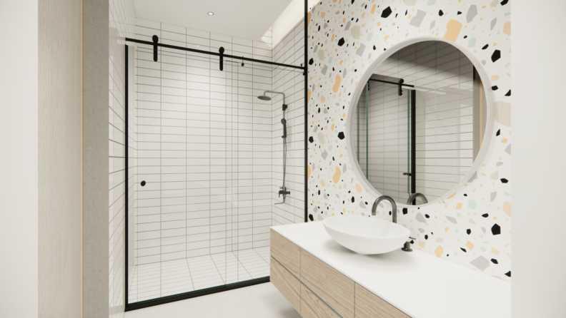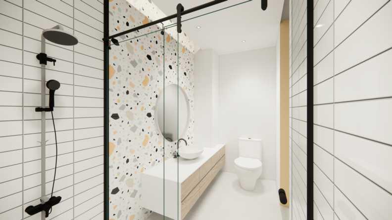 In addition to the ceiling and sliding doors, the other four walls of the shower room are covered with white tiles. The floor in the dry area is planned to use Reconstituted Stone Stack tiles.