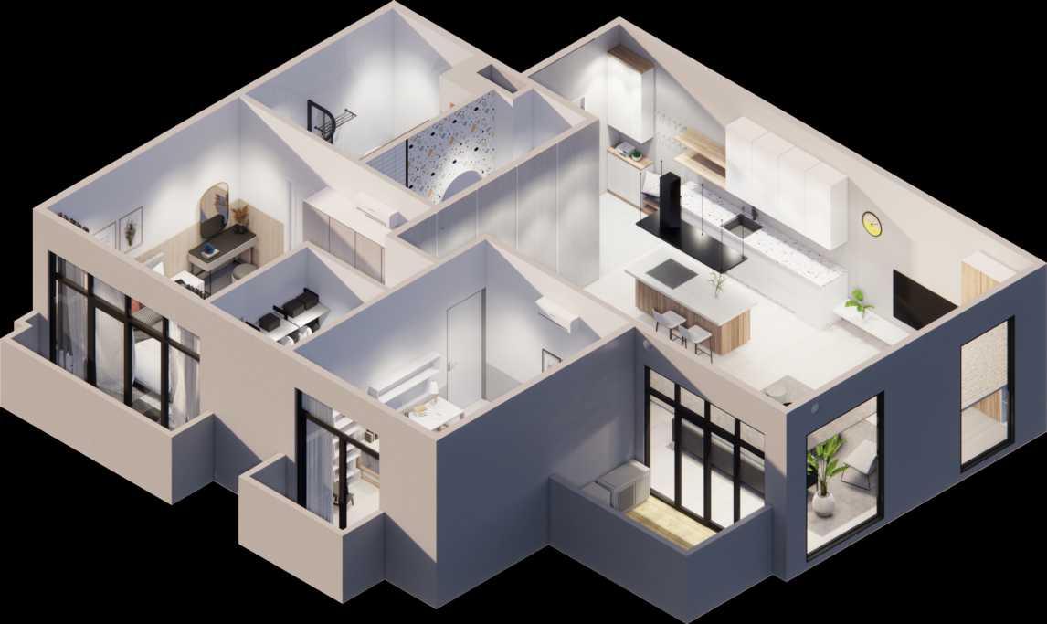 Floor-to-ceiling windows are on both the east and south sides of the flat, so natural light will shine into the interior from both directions.