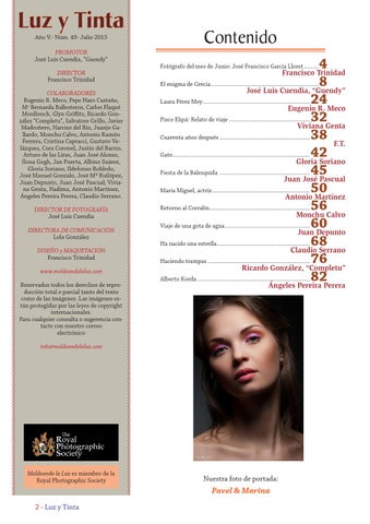 Año V.- Núm. 49- Julio 2015 PROMOTOR José Luis Cuendia, “Guendy” DIRECTOR Francisco Trinidad COLABORADORES Eugenio R. Meco, Pepe Haro Castaño, Ma Bernarda Ballesteros, Carlos Flaqué Monllonch, Glyn Griffits, Ricardo González “Completu”, Salvatore Grillo, Javier Madroñero, Narciso del Río, Juanjo Gallardo, Monchu Calvo, Antonio Ramón Ferrera, Cristina Capracci, Gustavo Velázquez, Cora Coronel, Justín del Barrio, Arturo de las Liras, Juan José Alonso, Ilona Gogh, Jan Puerta, Albino Suárez, Gloria Soriano, Ildefonso Robledo, José Manuel Gonzalo, José Mª Ruilópez, Juan Depunto, Juan José Pascual, Viviana Genta, Nadima, Antonio Martínez, Ángeles Pereira Perera, Claudio Serrano. DIRECTOR DE FOTOGRAFÍA José Luis Cuendia DIRECTORA DE COMUNICACIÓN Lola González DISEÑO y MAQUETACIÓN Francisco Trinidad www.moldeandolaluz.com Reservados todos los derechos de reproducción total o parcial tanto del texto como de las imágenes. Las imágenes están protegidas por las leyes de copyright internacionales. Para cualquier consulta o sugerencia contacte con nuestro correo electrónico