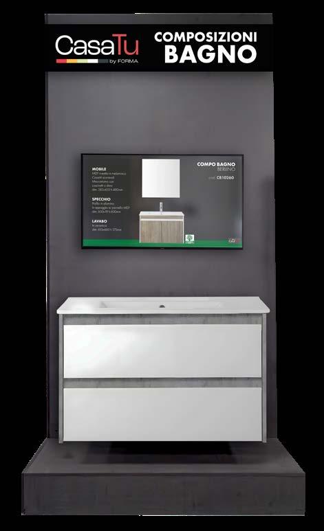 Con 3 metri lineari di scaffale è possibile esporre n°2 compo bagno più un televisore con presentazione video di tutta la gamma.