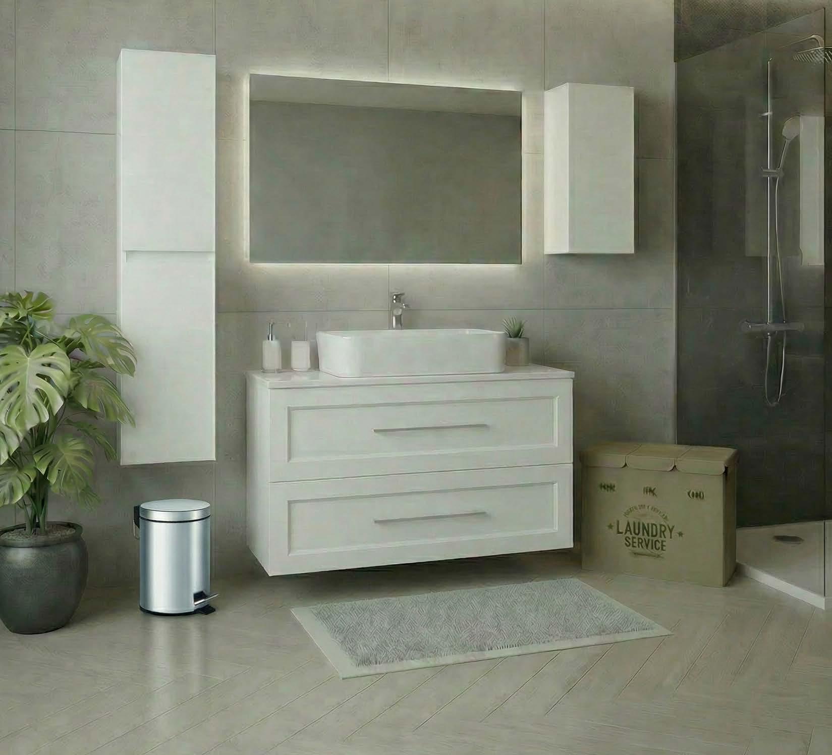 mobile 104x49 h52cm mdf bianco laccato con 2 cassetti, specchio 105x60cm, lavabo 60x41cm, rubinetteria esclusa
