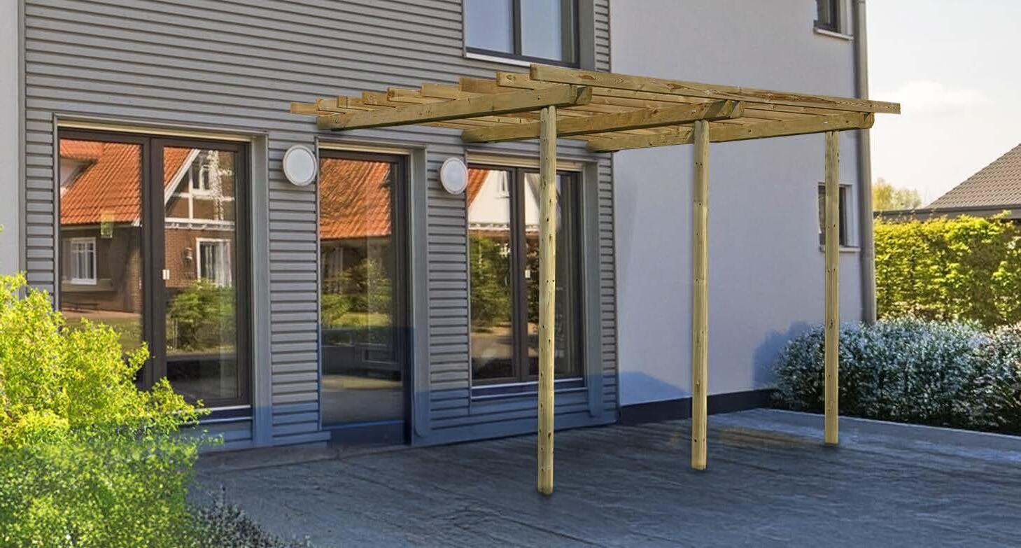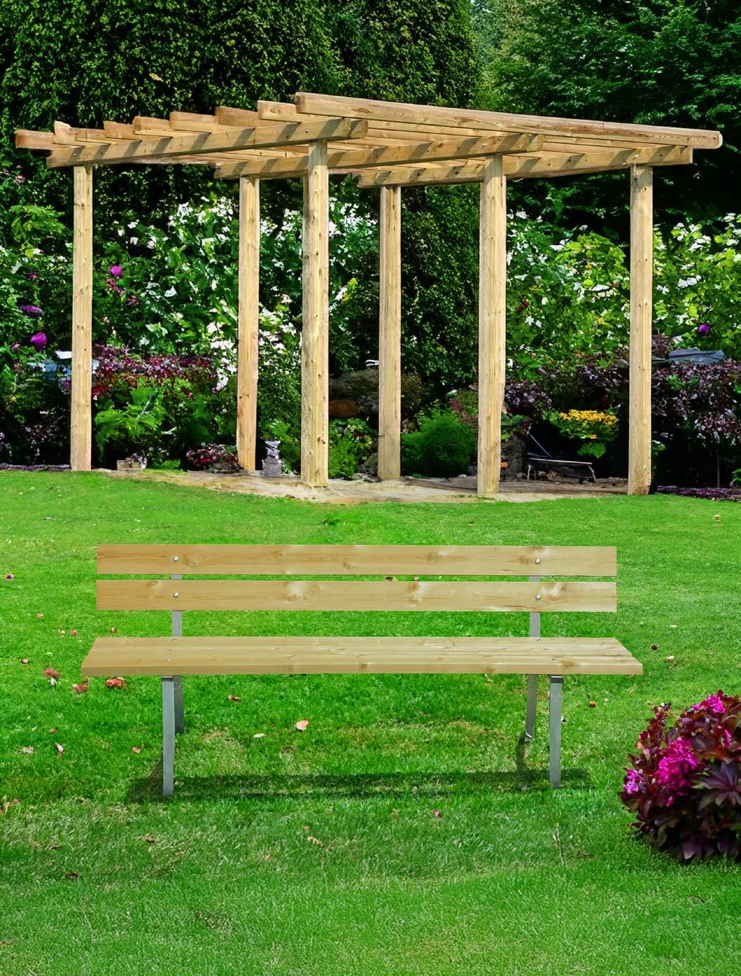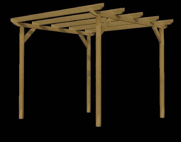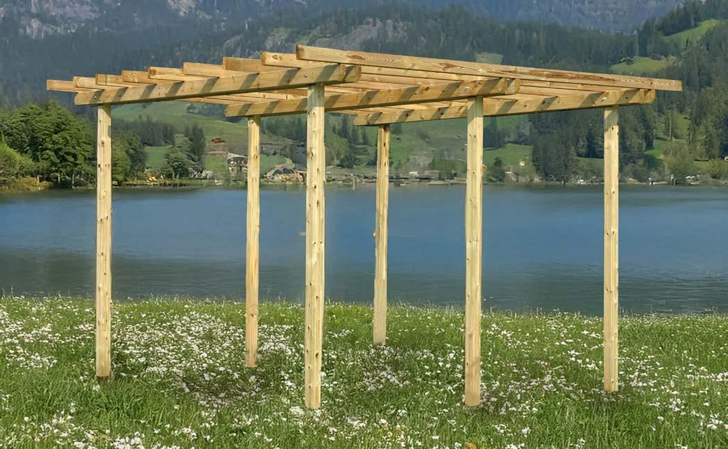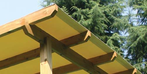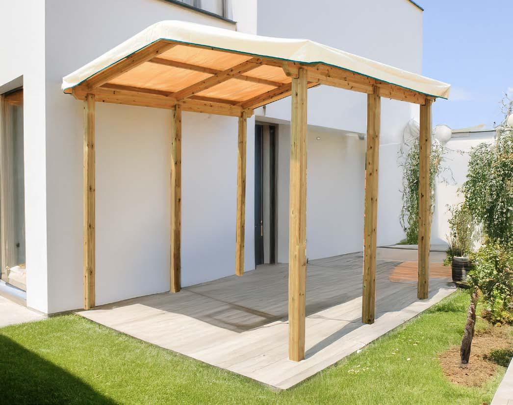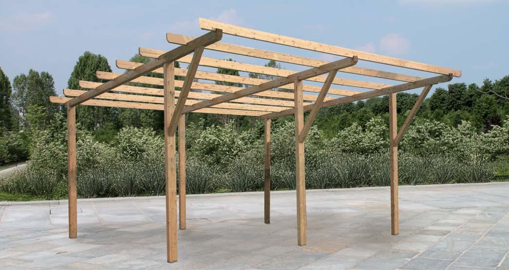 Tutti gli elementi che compongono la struttura sono realizzati con incastri legno-legno per un rapido montaggio senza piastre metalliche. Questo modello è progettato per coperture leggere e Forma propone dei teli di copertura in PVC interi o a striscie per le varie dimensioni a catalogo.