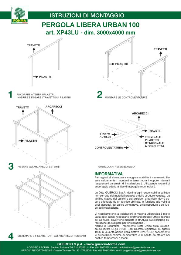 FORMA mette a disposizione del Cliente le schede di istruzioni per il montaggio delle strutture. Il documento illustra l’elenco dei componenti e la sequenza di assemblaggio del prodotto. I nostri tecnici sono a Vostra disposizione per ogni ulteriore informazione e consiglio.