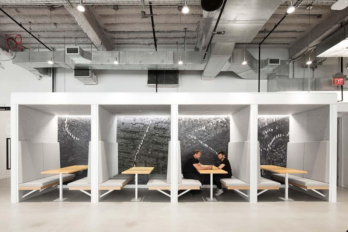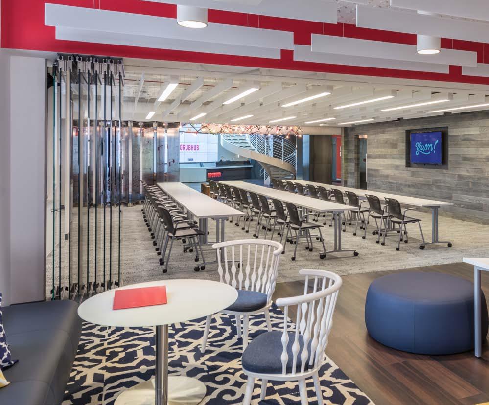 Barker and his team found that, while Grubhub had always had an open floor plan, there was a need for more multi-use collaborative spaces where coworkers could gather to work together. Establishing a more functional all-company gathering space was also crucial in ensuring that everyone in the company can meet. Finally, Barker wanted to create spaces that allowed employees to get away from their desks and unwind during the day.