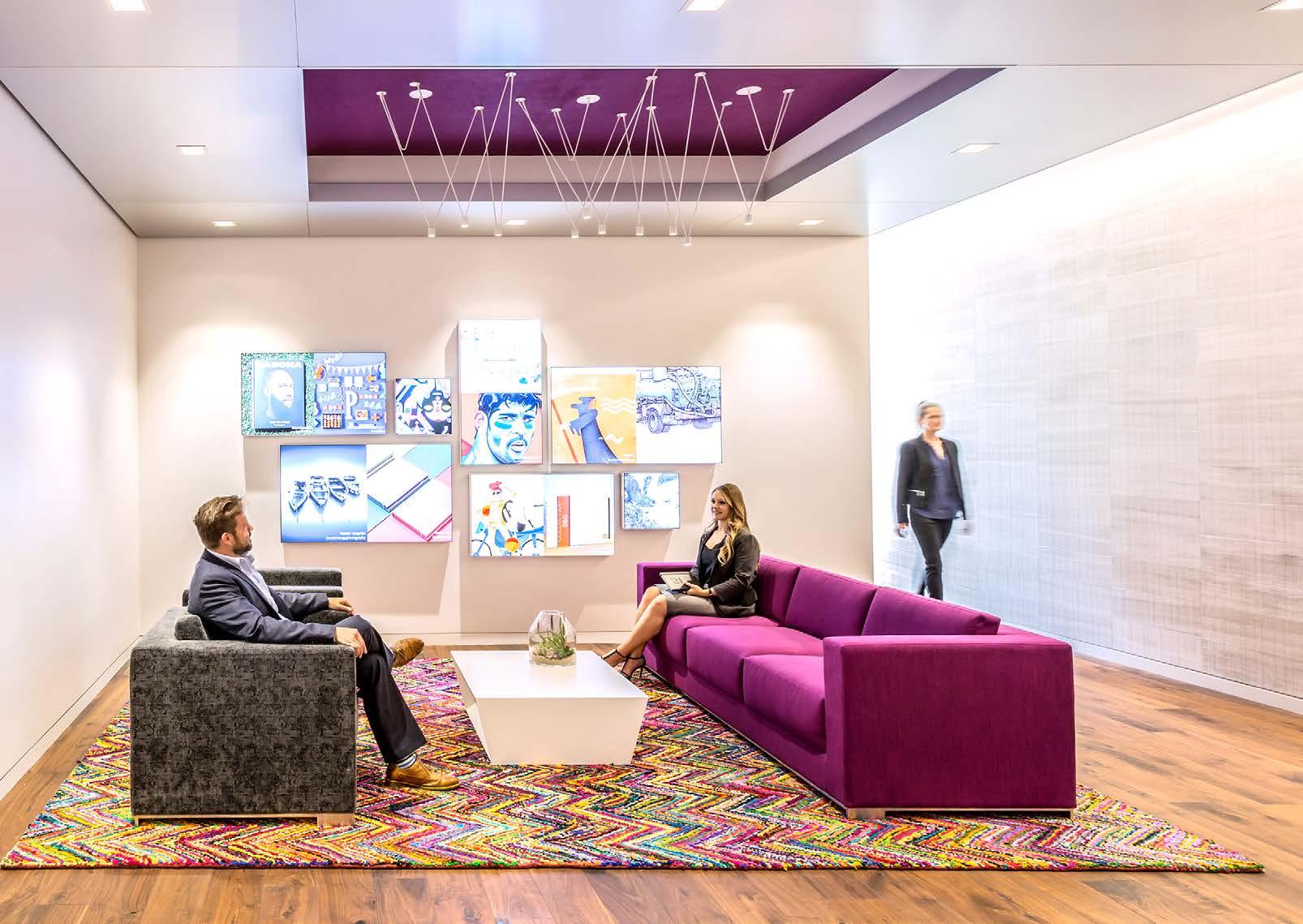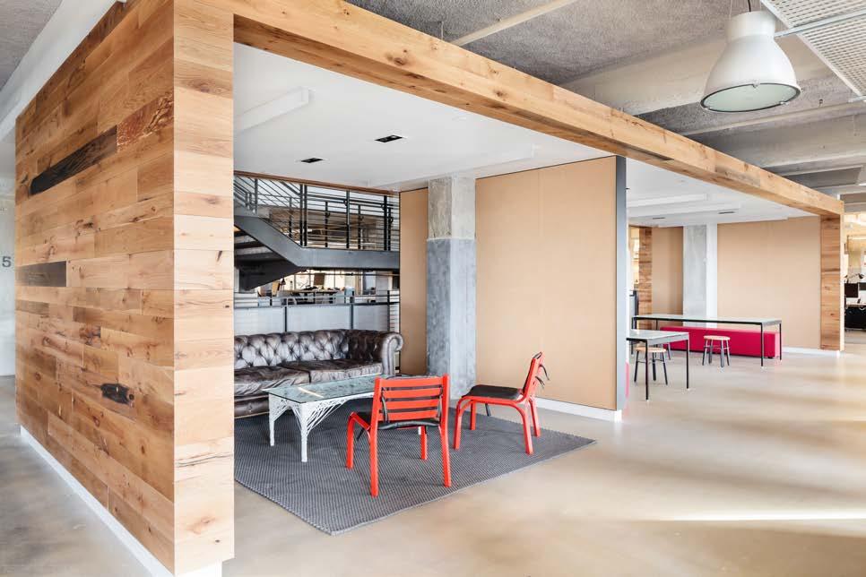 Office seating areas provide space for solo work, informal gatherings, and meetings.