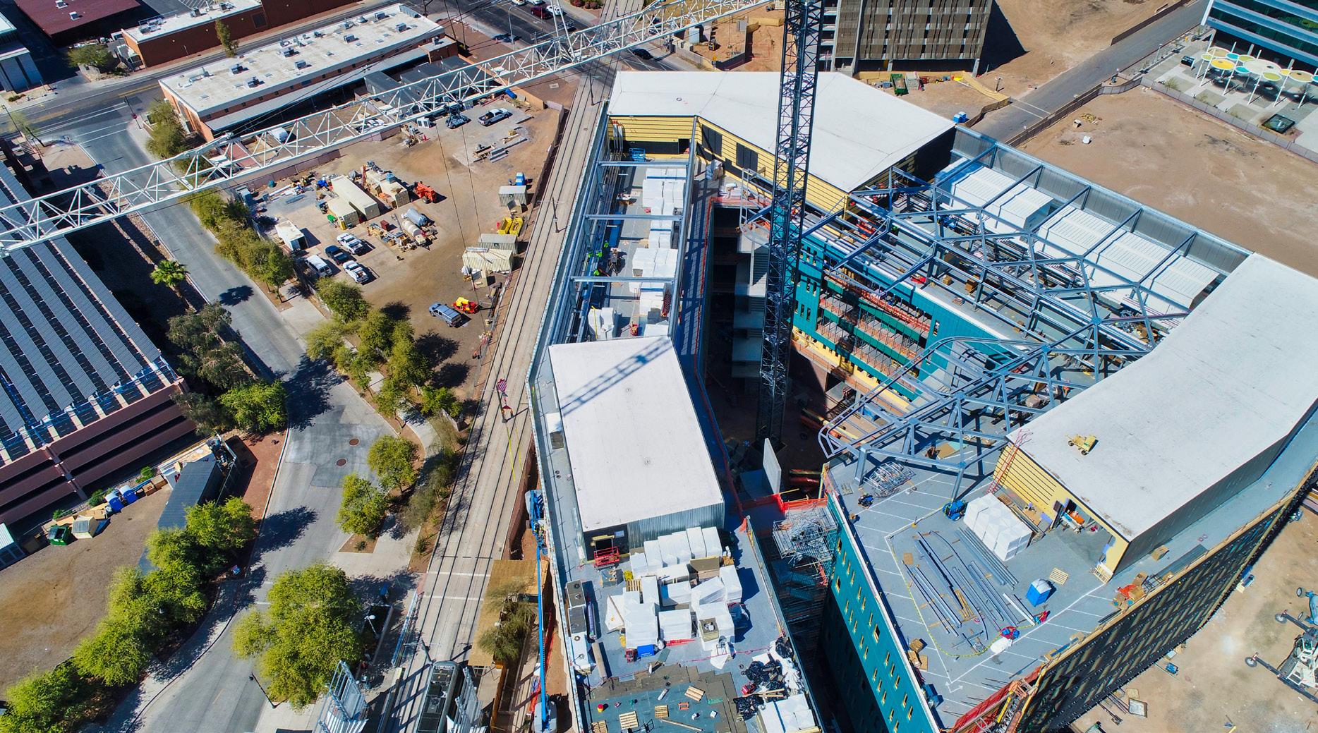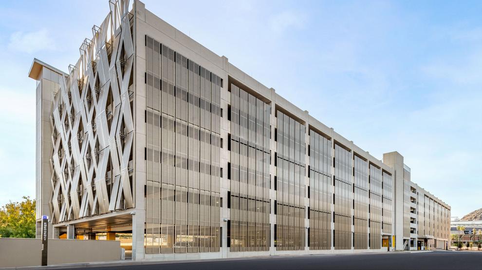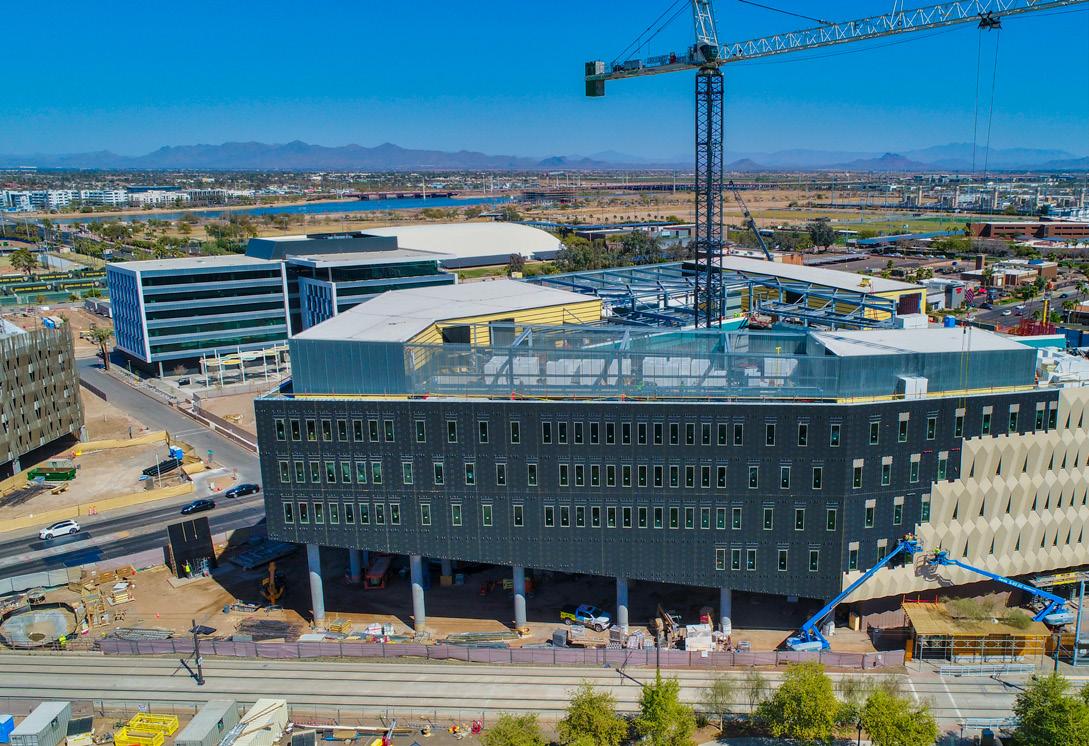 Arizona State University’s renovations include a new pedestrian bridge (top) that allows students to safely travel between the Novus Innovation Corridor and the Interdisciplinary Science and Technology Building 7 (bottom). Planters, glass-lined guardrails, and safety lighting all line the pathway for visibility and security. Pedestrians will even remain cool in Tempe’s desert climate under a steel fin shading structure. ISTB7 is a new facility for specialized research on the sustainability of food, water, and energy. Learn more about ASU’s campus developments on page 92.