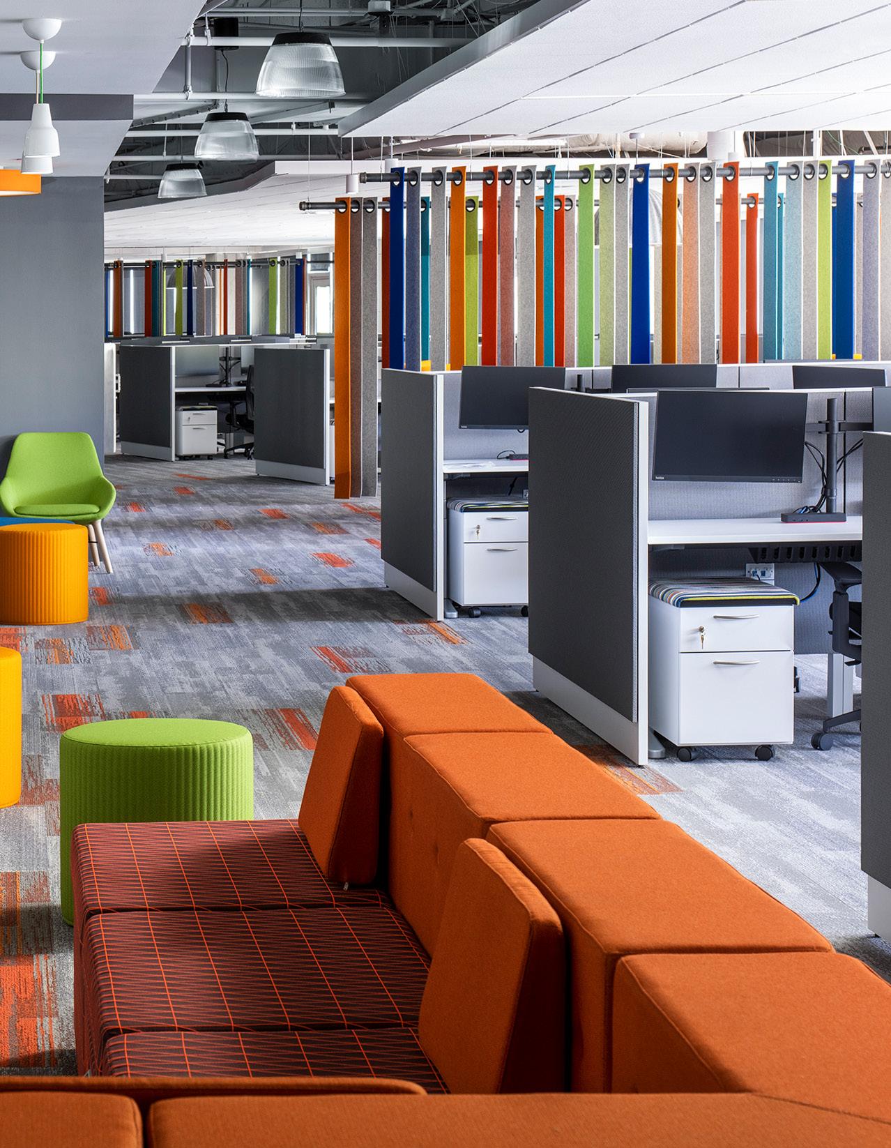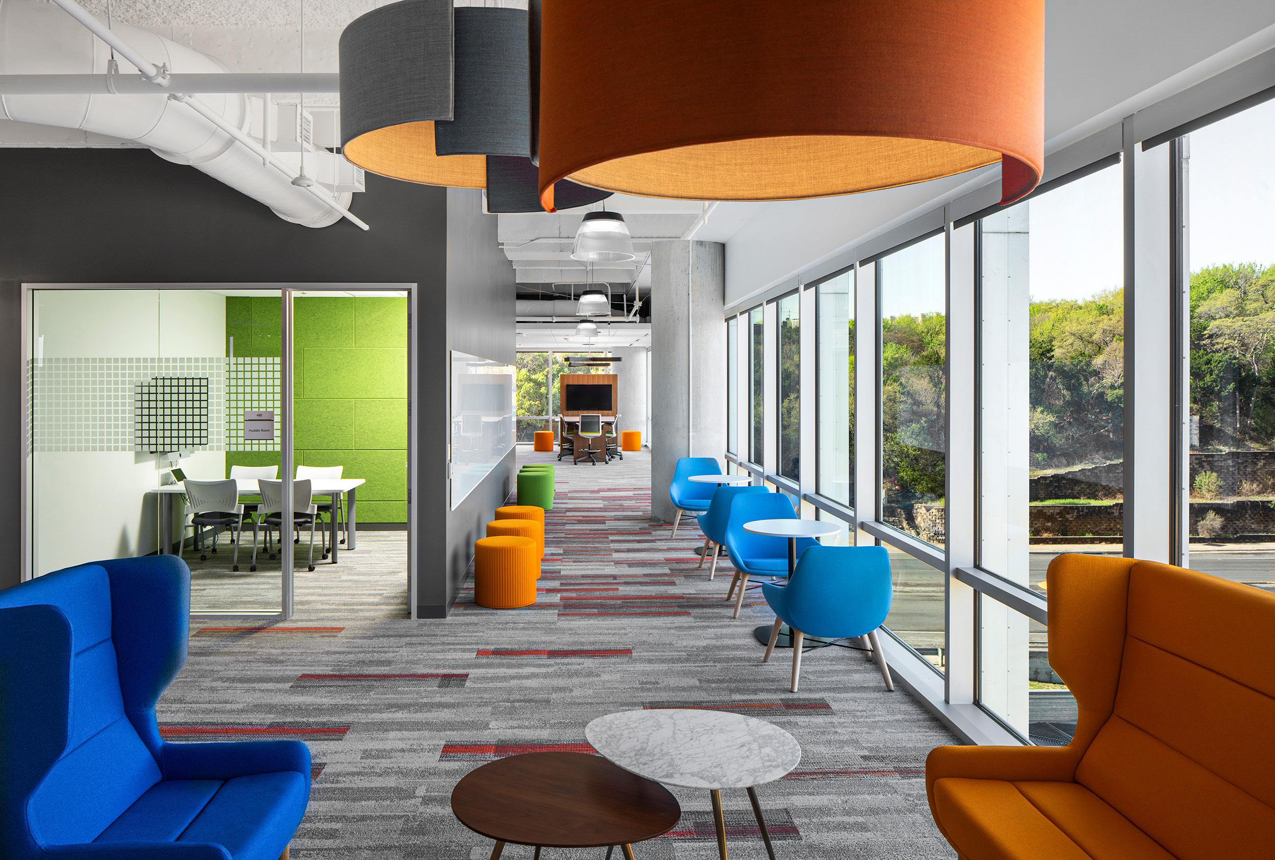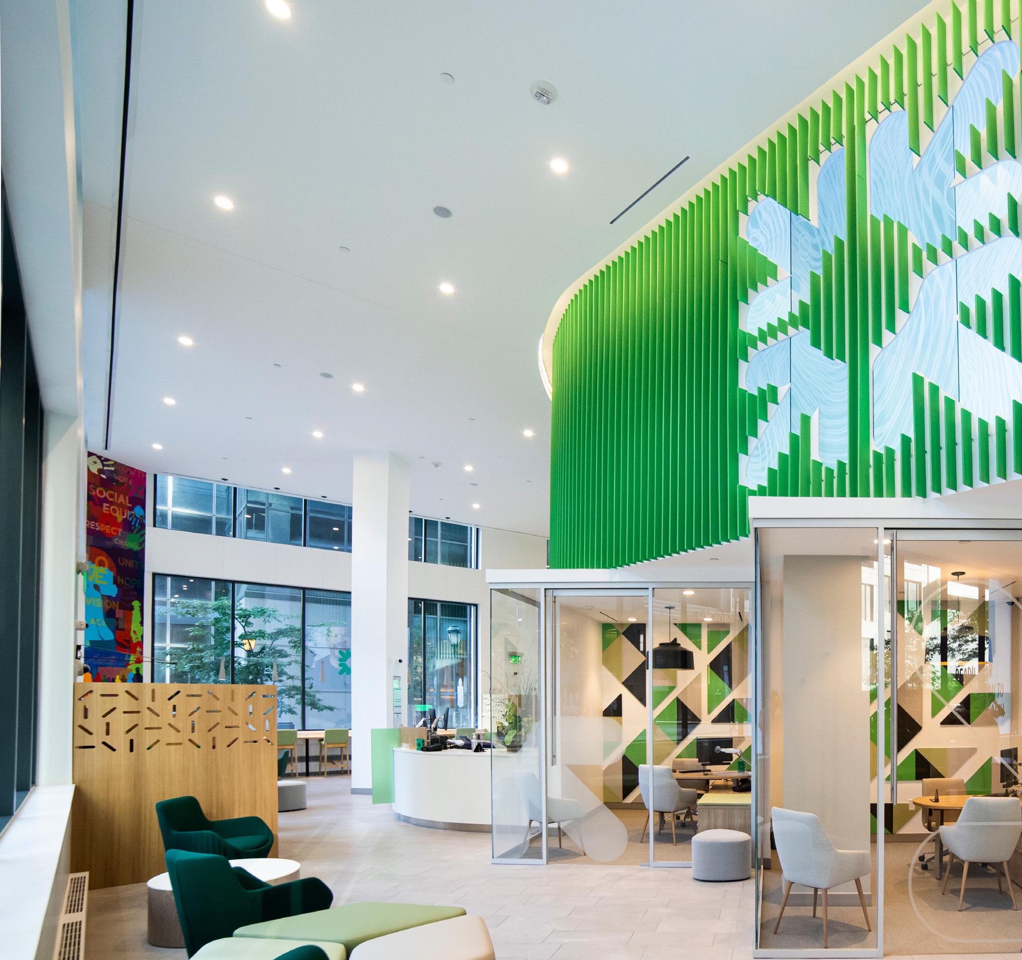 the whimsical. Color patterns reveal blue-gray hues tinged with plum, as to represent the winter mornings experienced by George Washington and his soldiers when they famously headquartered in the community throughout the late 18th century. Conversely, playful modern art from the Kalisher Art Lab imbues the space with a sense of warmth. Connecting it all is the common thread of people gathering for refuge and merriment— community being the phenomena that transcends eras.