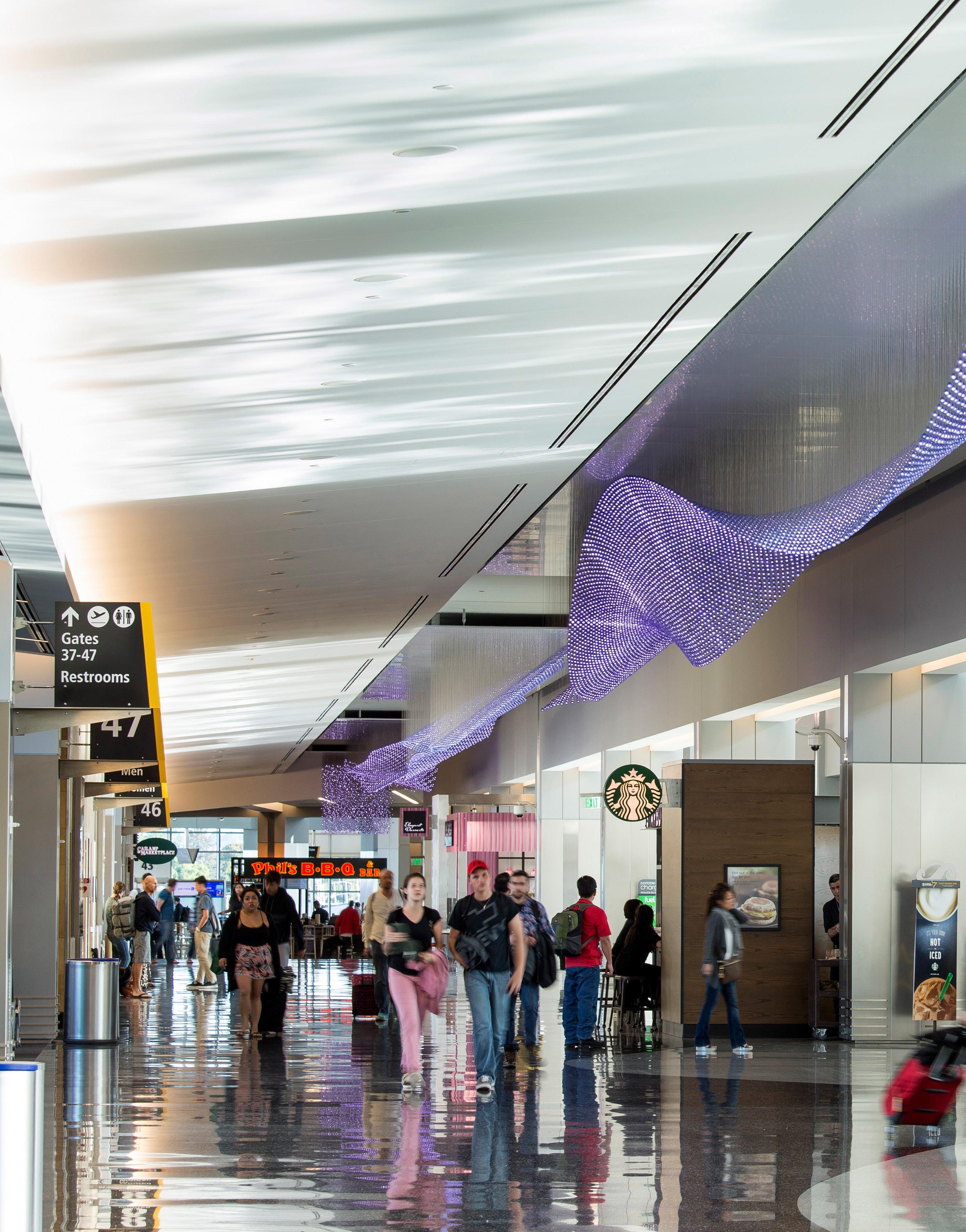 In June 2014, artist Norie Sato created a meditation room for the San Diego International Airport nicknamed “The Spirit of Silence.” With a color palette of calming grays and blues, it mimics water and sky so that passengers can find serenity pre- and post-flight. P156