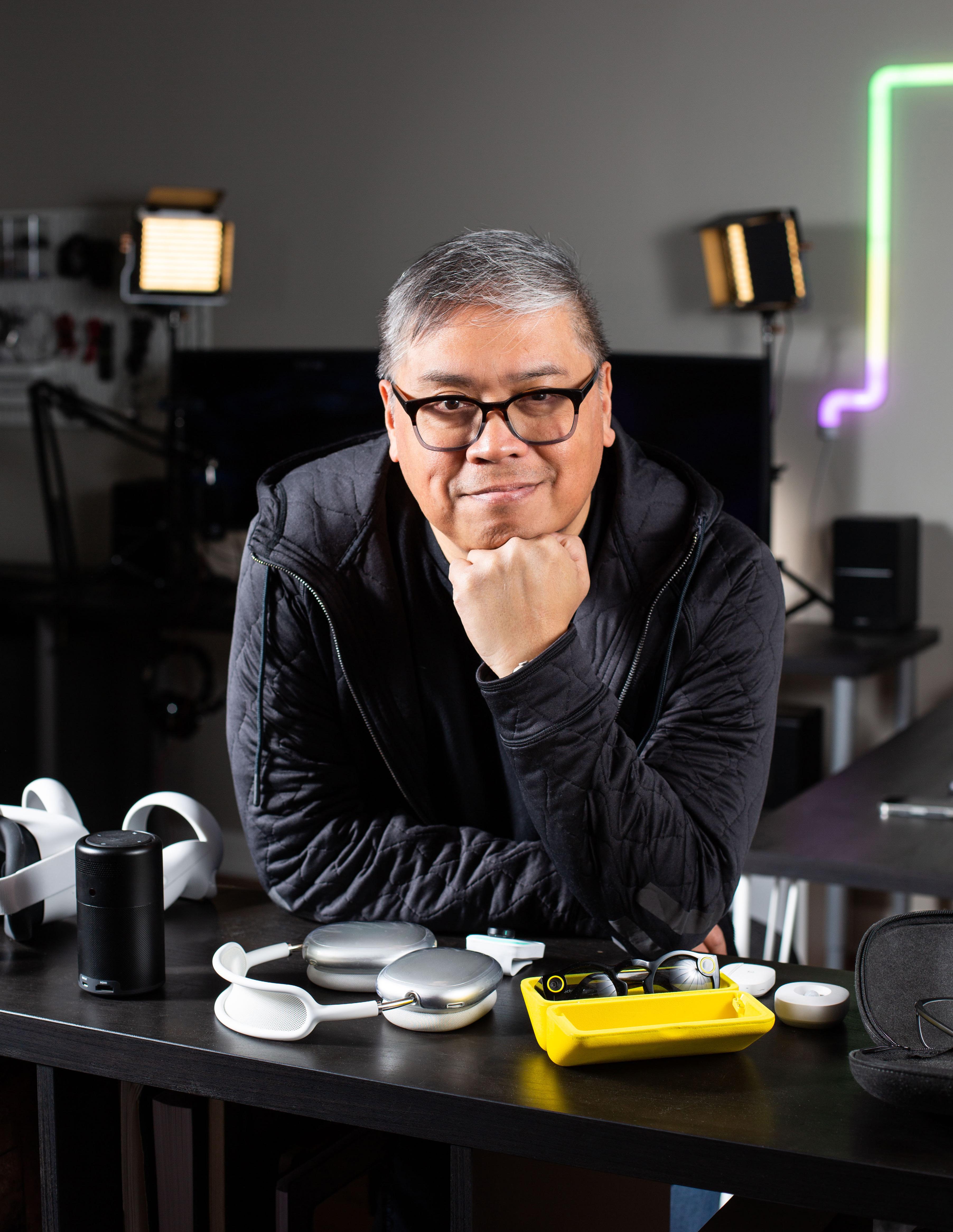 MELAINA K. DE LA CRUZ PORTRAITS BY CASS DAVIStep into Manolo Almagro’s subterranean home office, and you’ll be greeted by a mecca of tech. It’s all there. Everything ranging from a wall installation of (usable) charging ports to an early prototype of Google Glass eyeglasses to countless computer monitors displaying crypto prices, a global map of cybercrimes, and an endearing family photo slideshow. An industry vet, having held C-suite positions in major firms like TPN and Q Division, Almagro provides companies with thought leadership and expertise in digital transformation, experiential marketing, and emerging technology.