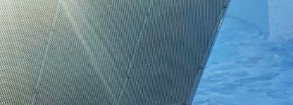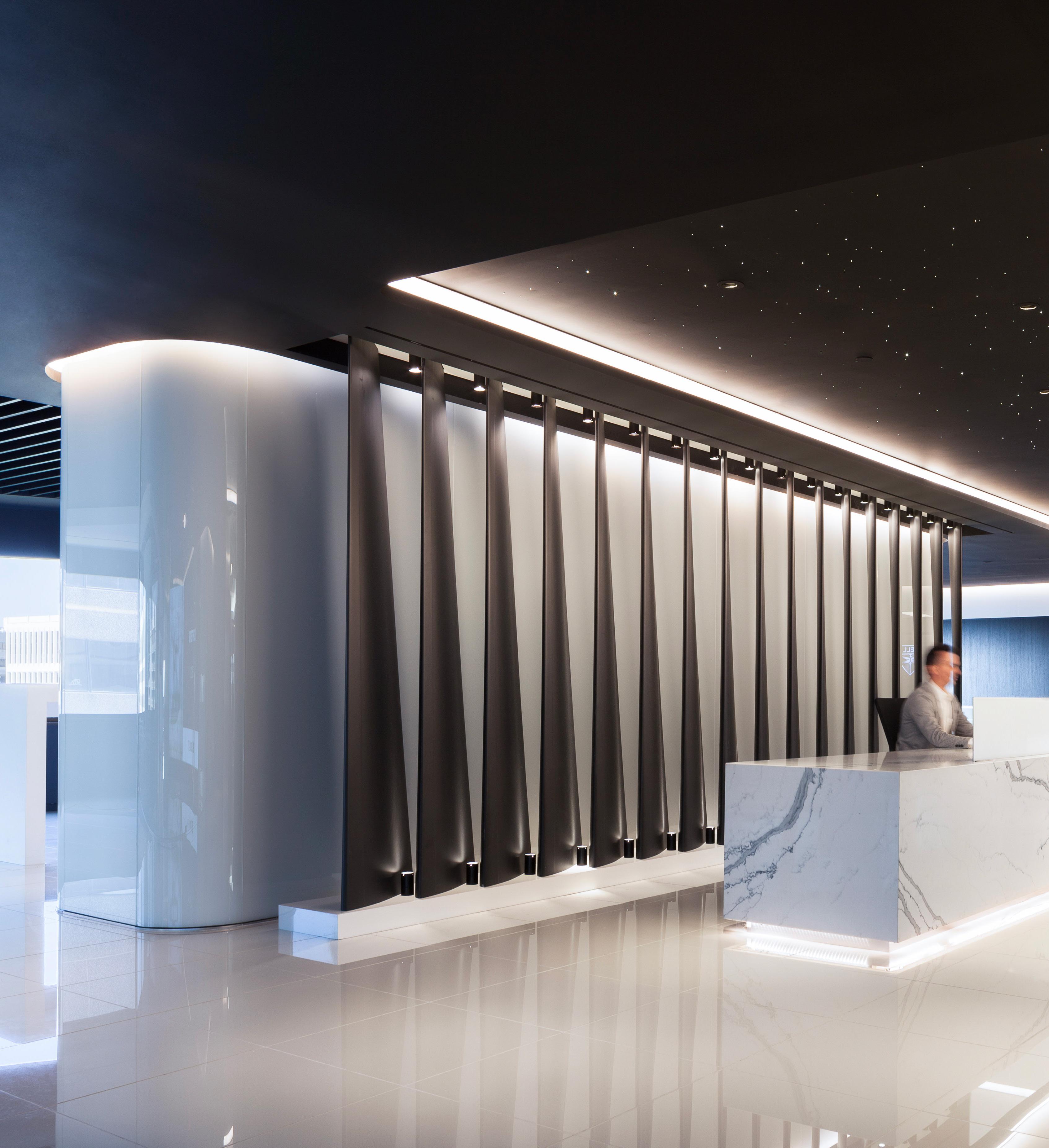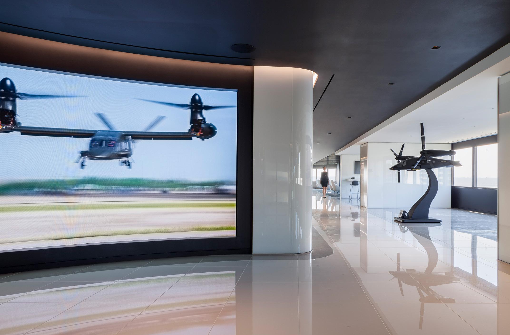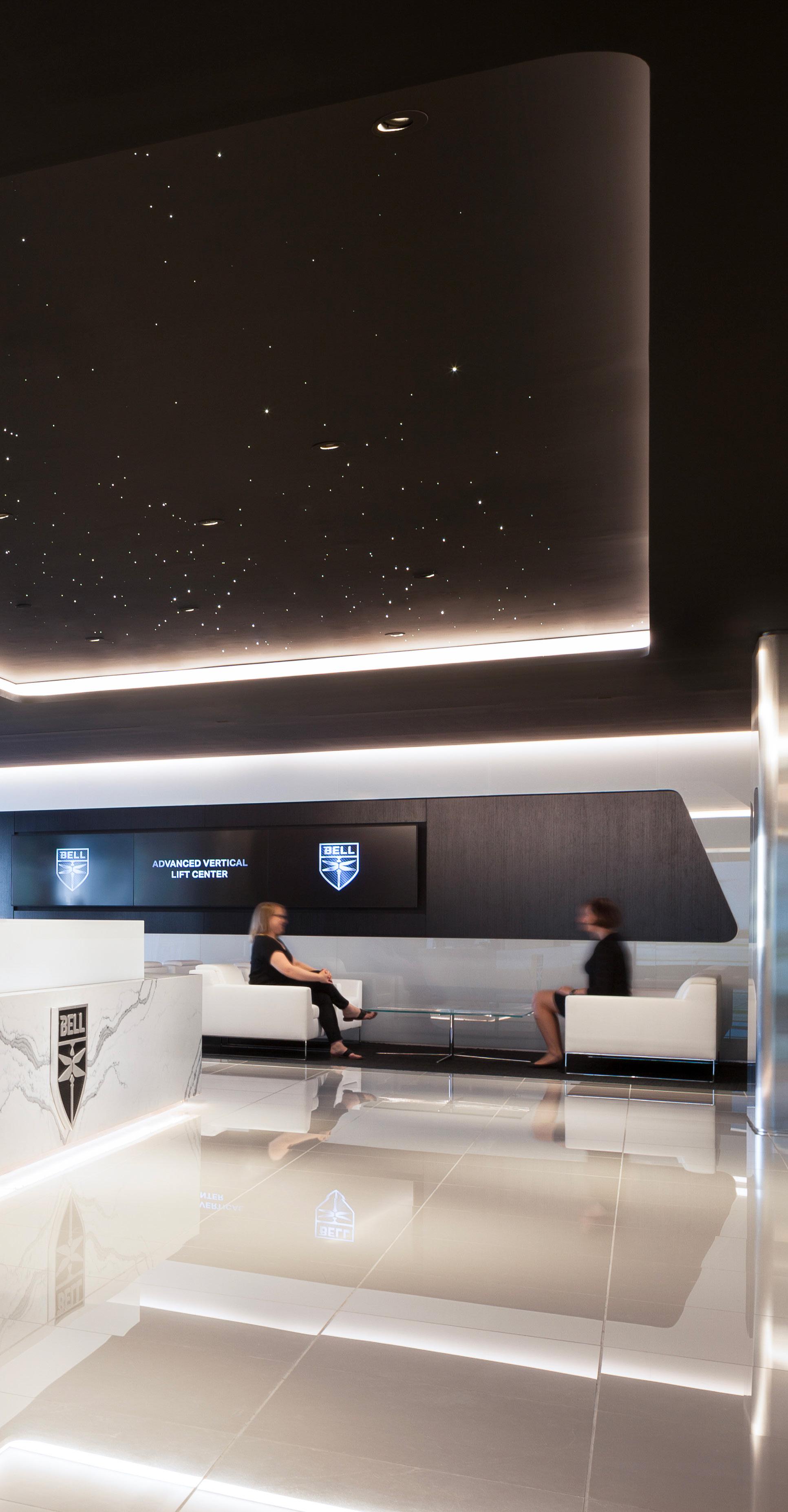 ◀ Bell’s Advanced Vertical Lift Center features a wall containing 17 replicas of the V280 Valor’s rotor blade and a “starry night” light field in the ceiling.