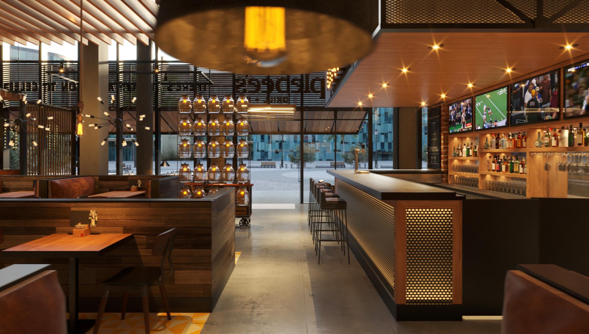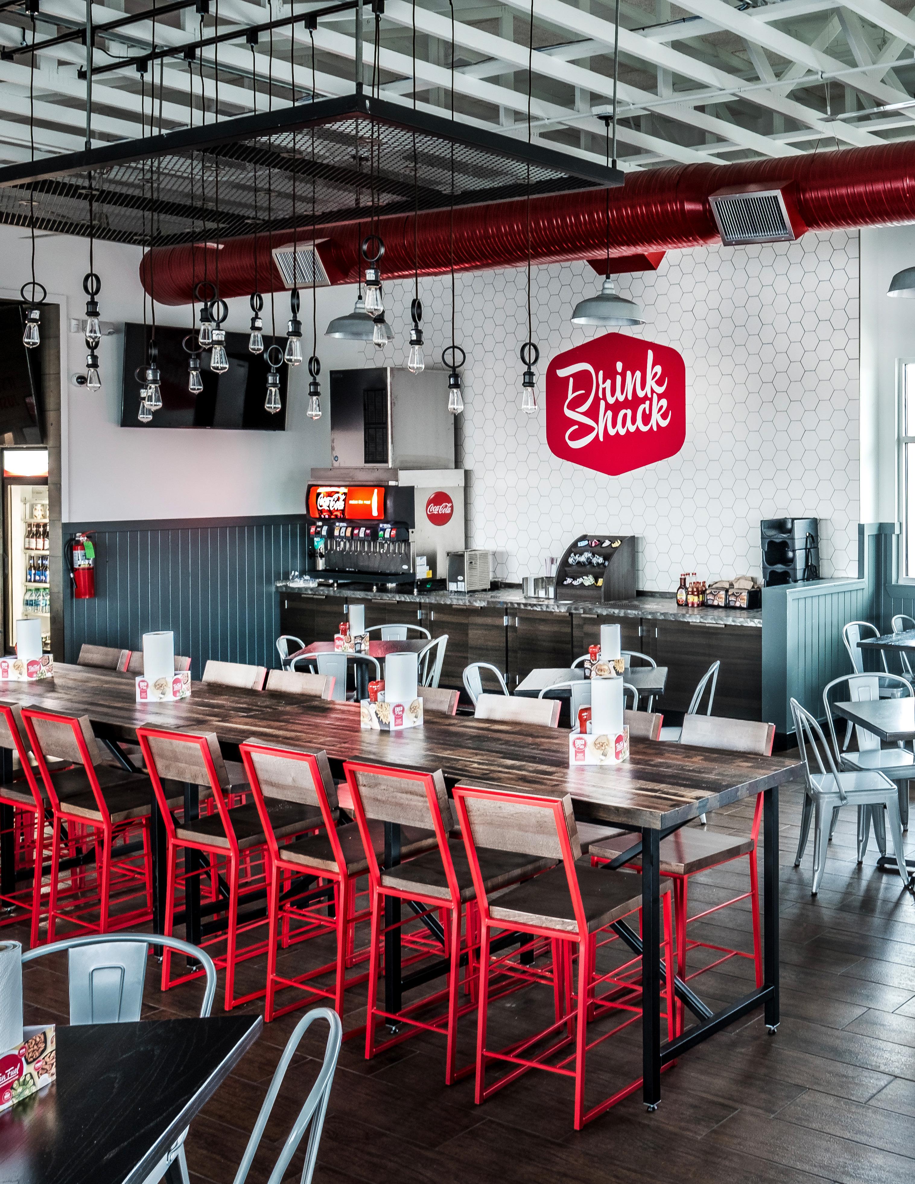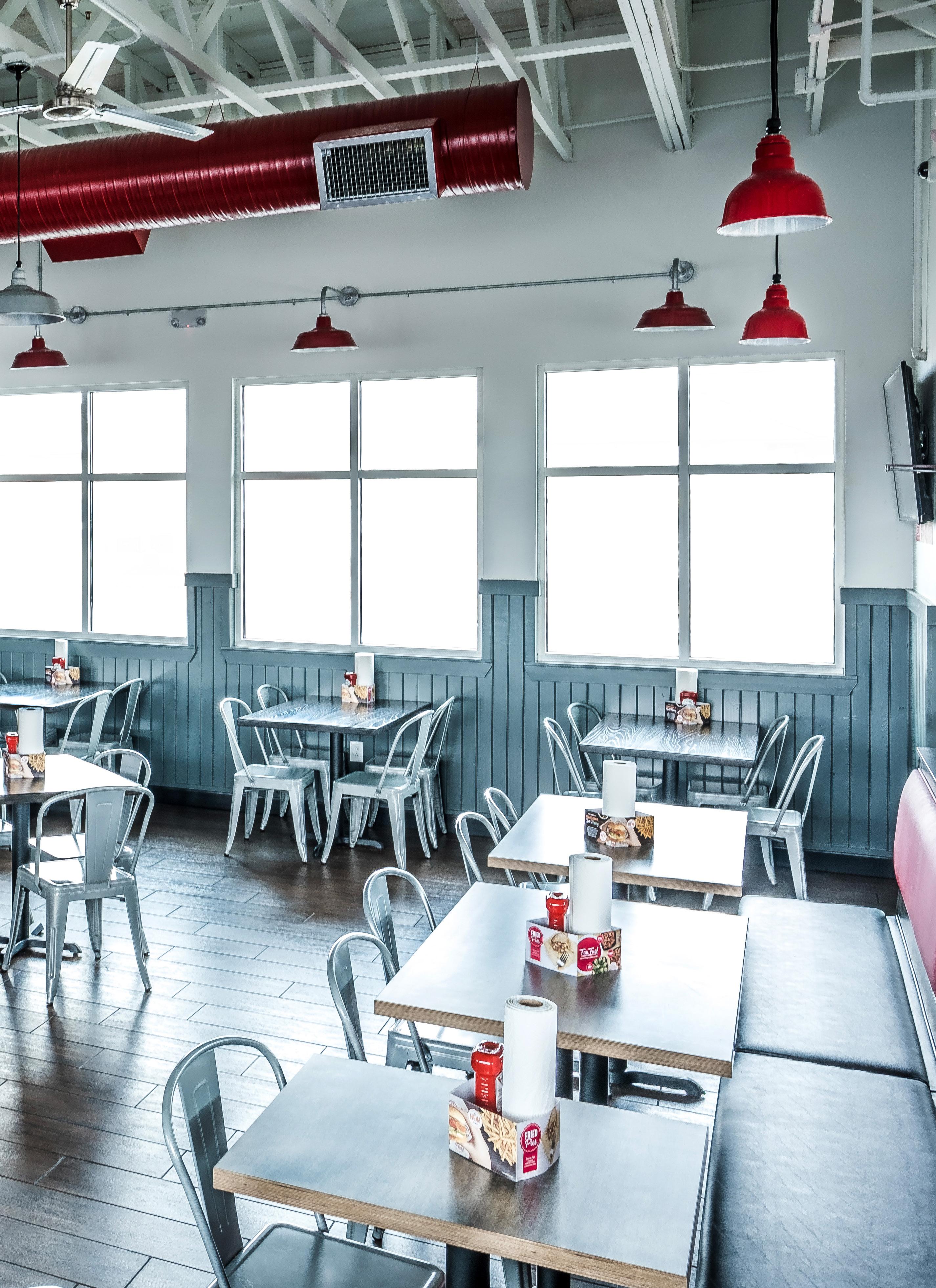 Biscuitville’s exterior design is inspired by the look of a Southern barn with fixtures like gooseneck lights, large barn doors, and a tin roof.