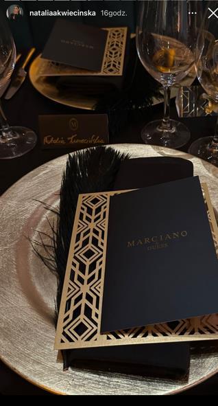 The dressing was kept to a luxury style with golden details and vintage and elegant decorations. White and gold flowers with feathers were central to the dinner tablespace. There were arranged additional branded elements including Marciano logo blocks, monograms, branded dessert, welcome sign, menus and place cards.