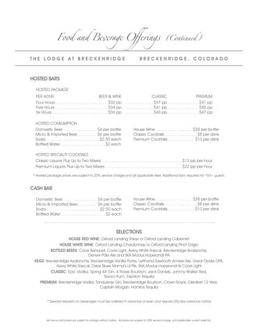 SELECTIONS HOUSE RED WINE: Oxford Landing Shiraz or Oxford Landing Cabernet HOUSE WHITE WINE: Oxford Landing Chardonnay or Oxford Landing Pinot Grigio BOTTLED BEERS: Coors Banquet, Coors Light, Avery White Rascal, Breckenridge Avalanche, Denver Pale Ale and SKA Modus Hoperandi IPA KEGS: Breckenridge Avalanche, Breckenridge Vanilla Porter, Lefthand Sawtooth Amber Ale, Great Divide DPA, Avery White Rascal, Oskar Blues Mama’s Lil Pils, SKA Modus Hoperandi & Coors Light CLASSIC: Epic Vodka, Spring 44 Gin, 4 Roses Bourbon, Jack Daniels, Johnny Walker Red, Tesoro Rum, Espolon Tequila PREMIUM: Breckenridge Vodka, Tanqueray Gin, Breckenridge Bourbon, Crown Royal, Glenlivet 12 Year, Captain Morgan, Hornitos Tequila * Special requests on beverages must be ordered in advance of even and require (30) day advance notice.