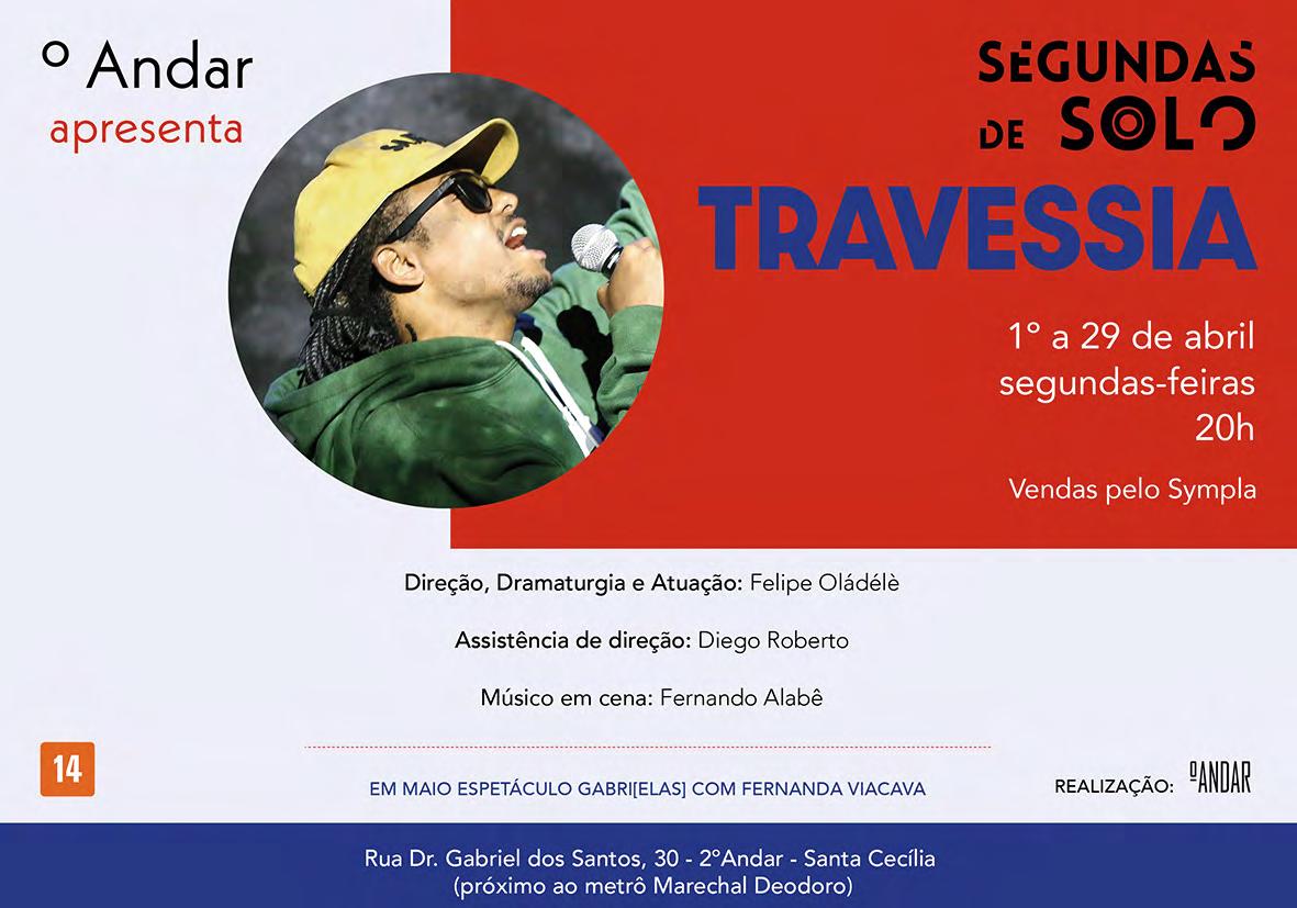 para evidenciar o que não é mostrado sobre esse território. O coletivo paulista, agora com mais vivência e maturidade política, social e territorial, une sua potência estética-narrativa a uma articulação comunitária. Com a Cia. Mungunzá de Teatro. Texto: Artistas da cena e Direção. Artistas da Cena: Átila Fragozo, Cleiton Ferreira, Danee Amorim, Índio Badaróss (em vídeo), Laurah Cruz, Léo Akio, Lucas Bêda, Marcos Felipe, Mc Docinho, Mc Nego Bala, Pedro das Oliveiras, Sandra Modesto, Verônica Gentilin e Virginia Iglesias. Direção: Cris Rocha, Georgette Fadel e Tânia Granussi. Teatro de Contêiner Mungunzá – R. dos Gusmões, 43. Santa Ifigênia. T. 11 97632.7852. Sábado e domingo, 18h; segunda, 20h. Gratuito (retirar ingressos com 1h antes na bilheteria). 80min. 16 anos. Até 08/04.