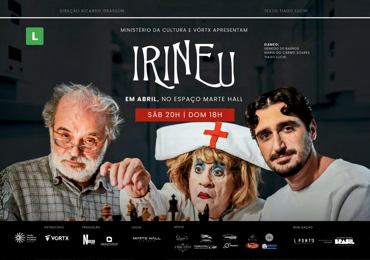 esconde alguns mistérios. Os dias no hospital parecem intermináveis para João Macena, porém seu companheiro de quarto os fazem ficar mais divertidos quando relata algumas das aventuras que já viveu. A montagem celebra os 50 anos de carreira de Genézio de Barros. Texto: Tiago Luchi. Elenco: Maria Do Carmo Soares, Genézio De Barros e Tiago Luchi. Direção: Ricardo Grasson. Teatro Marte Hall – R. Domingos de Morais, 348. Vila Mariana. T. 11 3542.4680. Sábado, 20h e domingo, 18h. R$80. 60min. Livre. Estreia 06/04. Não haverá apresentação nos dias 27 e 28/04.