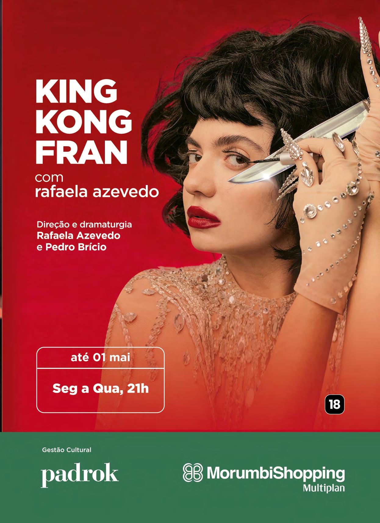 KNum misto de cabaré com circo e show de mulher-gorila, o espetáculo convida o público a conhecer o avesso dos estereótipos do feminino disseminados na sociedade. Partindo de referências como a atração circense Monga, A Mulher Gorila, e King Kong, o gorila gigante do cinema, a personagem promove uma irreverente e debochada reflexão sobre machismo, assédio, abuso, consentimento e violência de gênero. Dramaturgia e direção: Rafaela Azevedo e Pedro Brício. Elenco: Rafaela Azevedo. Teatro MorumbiShopping – Av. Roque Petroni Júnior, 1.089. Piso G1. Jardim das Acácias. T. 11 5183.2800. Segunda a quarta, 21h. R$100. 70min. 18 anos.