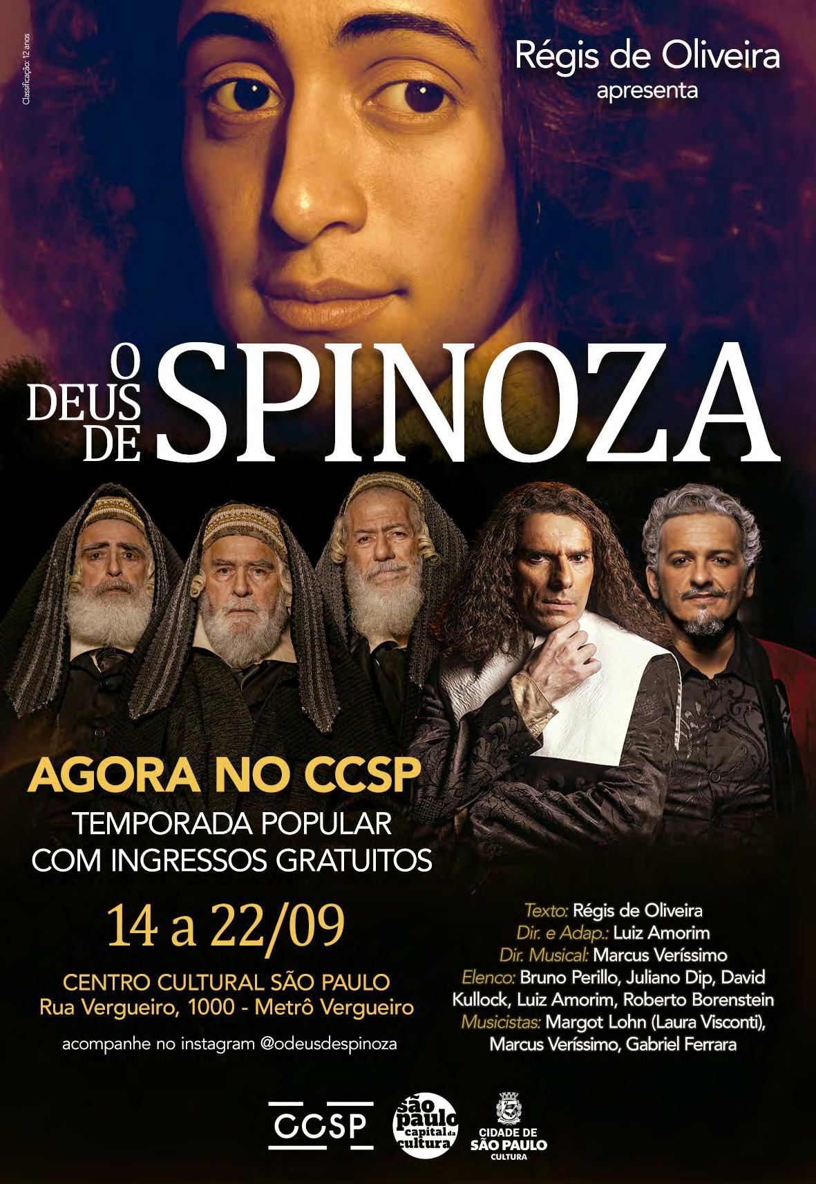 O espetáculo resgata o pensamento do reconhecido filósofo holandês Baruch de Spinoza, condenado no século XVII por sua reflexão sobre a relação do ser humano com Deus e com a Natureza, contestando dogmas religiosos da época. Renegado por séculos, seu pensamento foi resgatado e hoje é motivo de estudos no mundo inteiro. Texto: Régis de Oliveira. Elenco: Bruno Perillo, Juliano Dip, David Kullock, Luiz Amorim e Roberto Borenstein. Musicistas: Margot Lohn (Laura Visconti), Marcus Veríssimo, Gabriel Ferrara. Direção e adaptação: Luiz Amorim. Centro Cultural São Paulo / Sl. Jardel Filho - R. Vergueiro, 1000. Liberdade. T. 11 3397.4002. Quinta a sábado, 21h; domingo, 20h. Gratuito (retirar ingressos com 1h antes na bilheteria ou pelo site https:// centrocultural.sp.gov.br/). 75min. 12 anos. De 14 a 22/09.