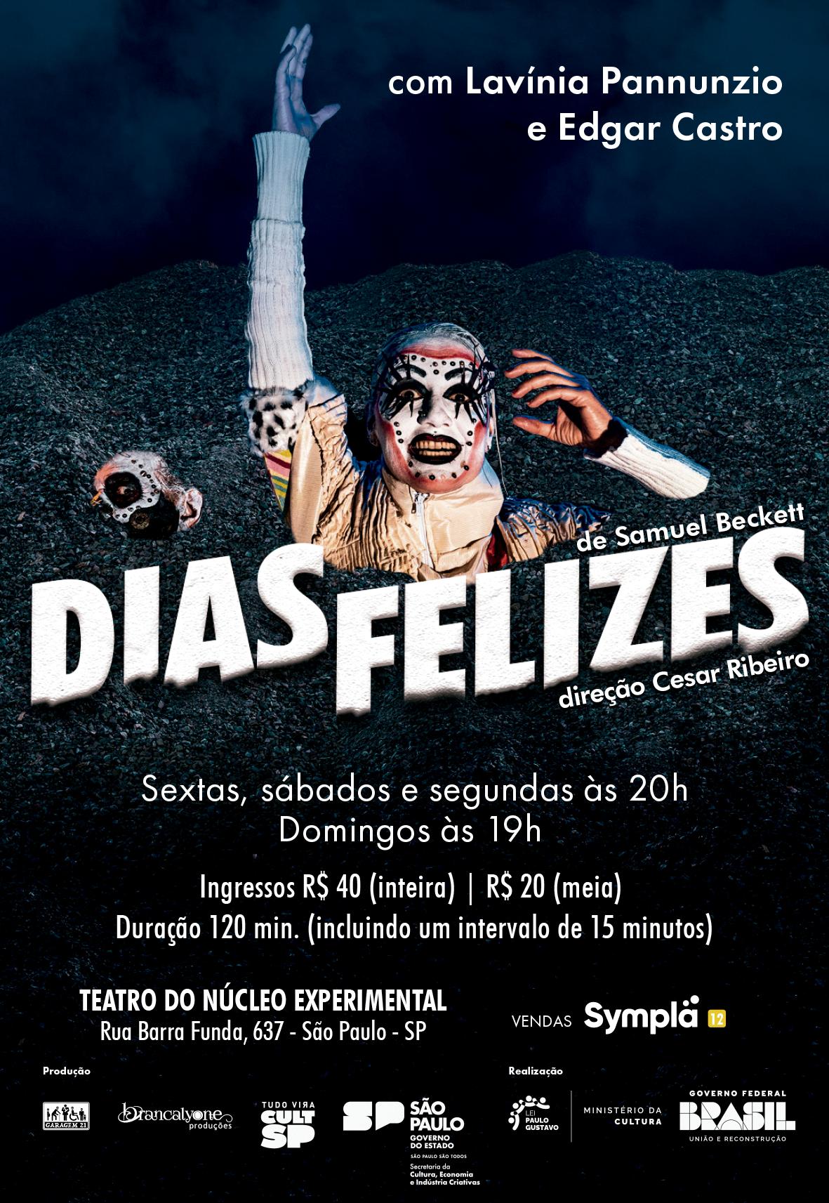Uma mulher de 50 anos que dialoga de modo otimista sobre um passado glorioso e a esperança de dias melhores. Nessa condição precária, em um cenário desértico, ela se agarra às palavras e a seus últimos pertences para enfrentar a passagem do tempo e comandar seu universo de esperanças contraditórias com a realidade em que está inserida. Texto: Samuel Beckett. Elenco: Lavínia Pannunzio e Edgar Castro. Direção: Cesar Ribeiro. Teatro do Núcleo Experimental –R. Barra Funda, 637. Barra Funda. T. 11 3259.0898. Sexta, sábado e segunda, 20h; domingo, 19h. R$40. 120min. 12 anos. Reestreia 13/09.