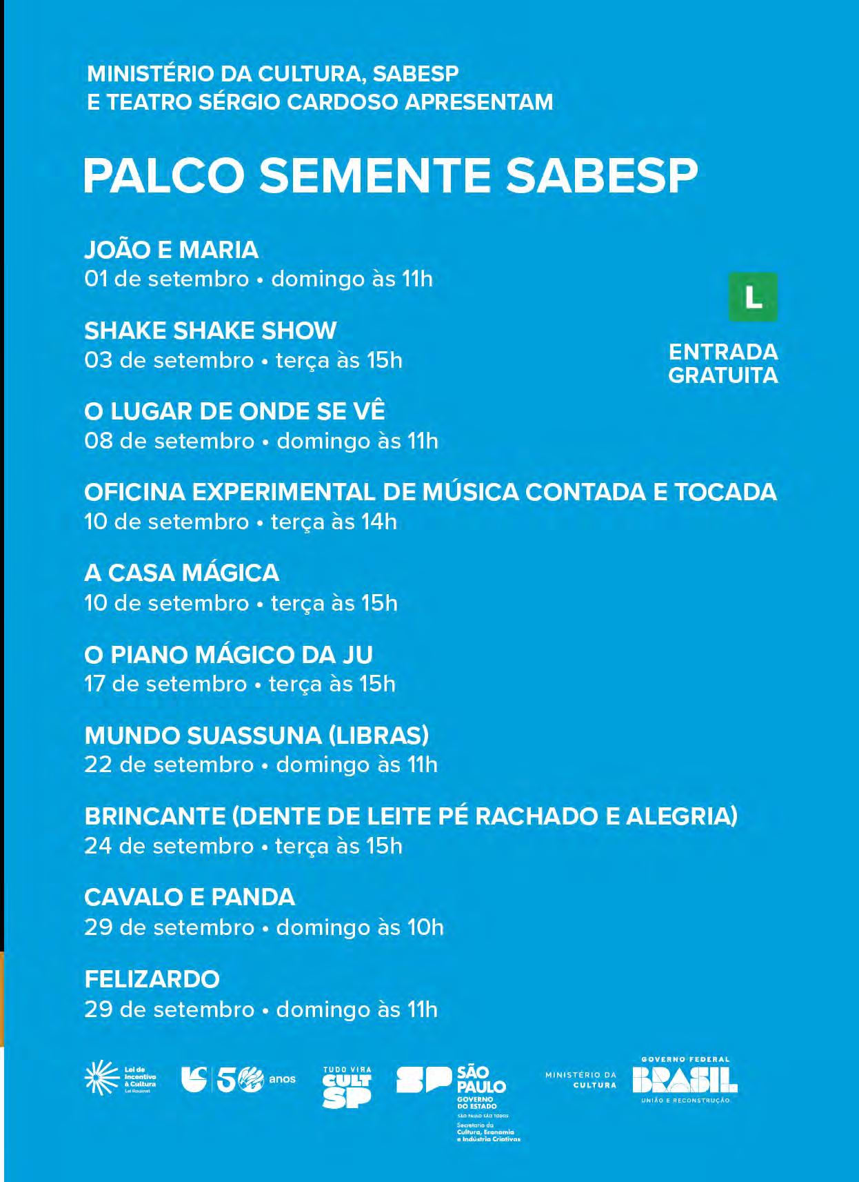 às crianças um espaço onde elas possam explorar a magia do teatro de forma ativa e participativa. Teatro Sérgio Cardoso - R. Rui Barbosa, 153. Bela Vista. T. 11 3882.8080. Gratuito (retirar ingressos com 1h antes na bilheteria). Programação: https://teatrosergiocardoso.org.br/pt-br/ agenda-cultural/palco-semente-sabesp/