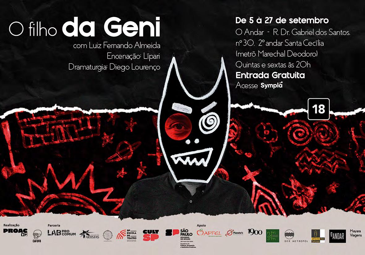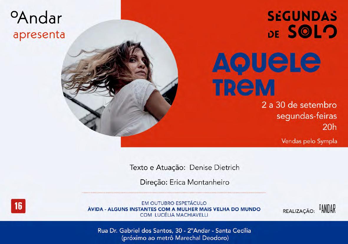 abusos que sofreu, inadvertidamente perpetuou, e aprendeu a normalizar. Dramaturgia: Diego Lourenço. Elenco: Luiz Fernando Almeida. Encenação: Lípari. ºAndar - R. Dr. Gabriel dos Santos, 30. Santa Cecília. T. 11 3666.6138. Quinta e sexta, 20h. Gratuito (ingresso pelo Sympla). 60min. 18 anos. De 05 a 27/09.