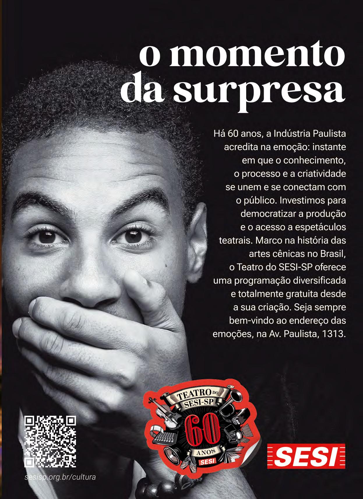 fresta. Este ato evoca uma entidade capaz de trafegar por tempos antigos, entrelaçar narrativas e revisitar a história da proibição da dança no deserto. Dramaturgia e direção: Caio Silviano. Elenco: Amanda Quintero, Cecília Barros, Ian Noppeney, Rafael Érnica, Alice Guêga, Bernardo Bibancos, Henrique Reis, Juliano Veríssimo, Barroso e Gabriela Sugui. Teatro de Contêiner MungunzáR. dos Gusmões, 43. Santa Ifigênia. T. 11 98562.3533. Sexta, sábado e segunda, 20h; domingo, 19h. R$30. 135min. 16 anos. De 06 a 30/09.