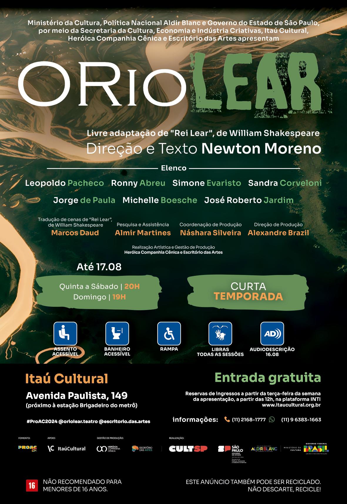 Uma Tragédia Ambiental, livremente inspirado em “Rei Lear”, de William Shakespeare. A montagem adapta e transpõe a fábula do monarca que decide dividir seu reino entre as três filhas. Já em ORioLEAR, um senhor de terras — latifundiário, antigo grileiro que fez fortuna — decide repartir suas propriedades e plantações entre as filhas e os genros. Texto e direção: Newton Moreno. Elenco: Leopoldo Pacheco, Ronny Abreu, Simone Evaristo, Sandra Corveloni, Jorge de Paula, Michelle Boesche e José Roberto Jardim. Itaú Cultural / Sl. Itaú Cultural - Av. Paulista, 149. Bela Vista. T. 11 2168.1777. Quinta a sábado, 20h; domingo, 19h. Gratuito (reserva de ingresso a partir da terça da semana da apresentação, a partir das 12h, na plataforma INTI – www. itaucultural.org.br). 16 anos. Até 17/08.