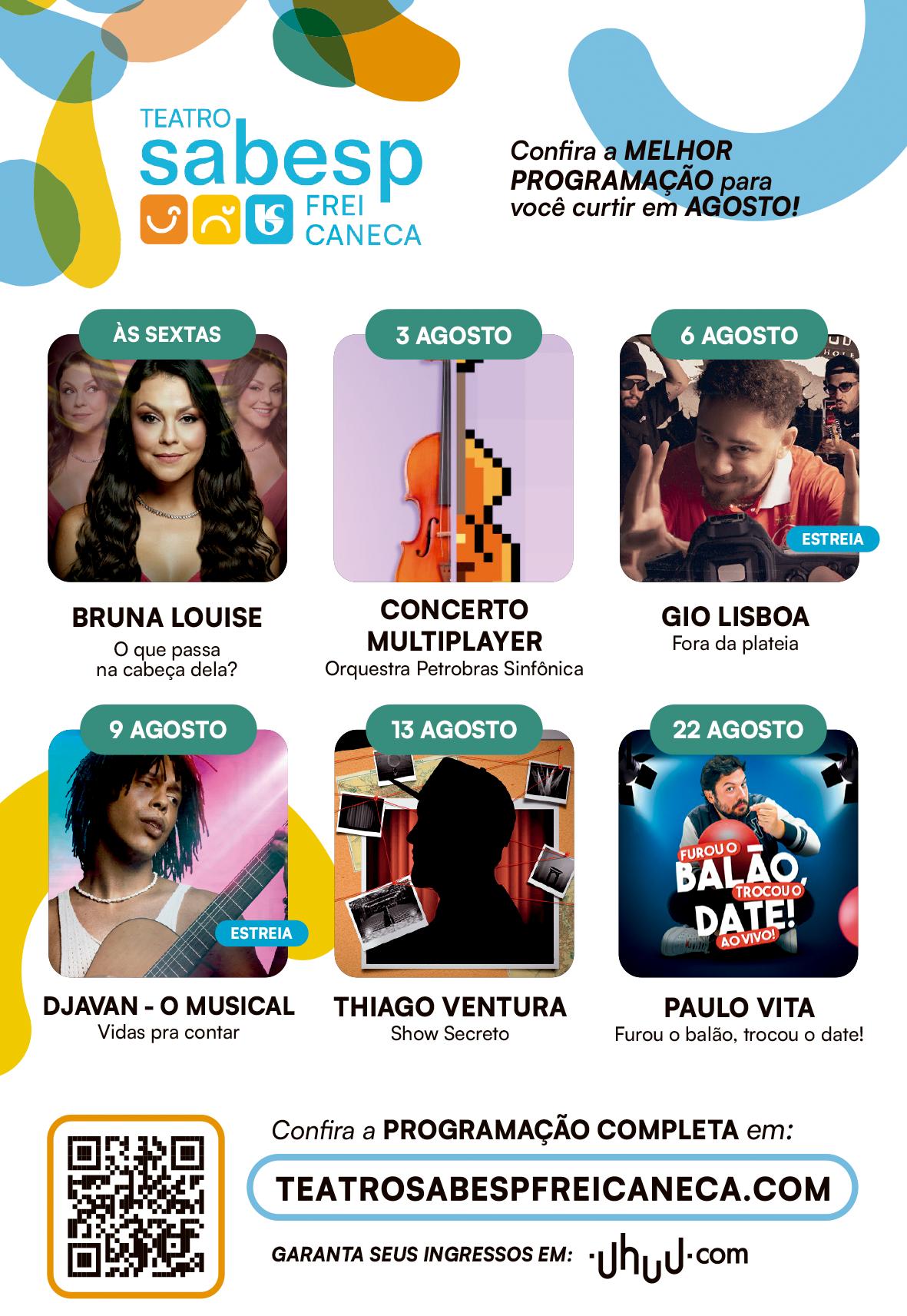 Histórias reais, improvisos e interações conectar-se profundamente com a plateia. A comediante transforma desafios em risadas, compartilhando experiências pessoais que celebram vitórias e arrancam gargalhadas das derrotas. Elenco: Bruna Louise. Teatro Sabesp Frei Caneca - R. Frei Caneca, 569. Consolação. Dias 01, 15, 22 e 29/08, 22h30. A partir de R$50. 70min. 14 anos.