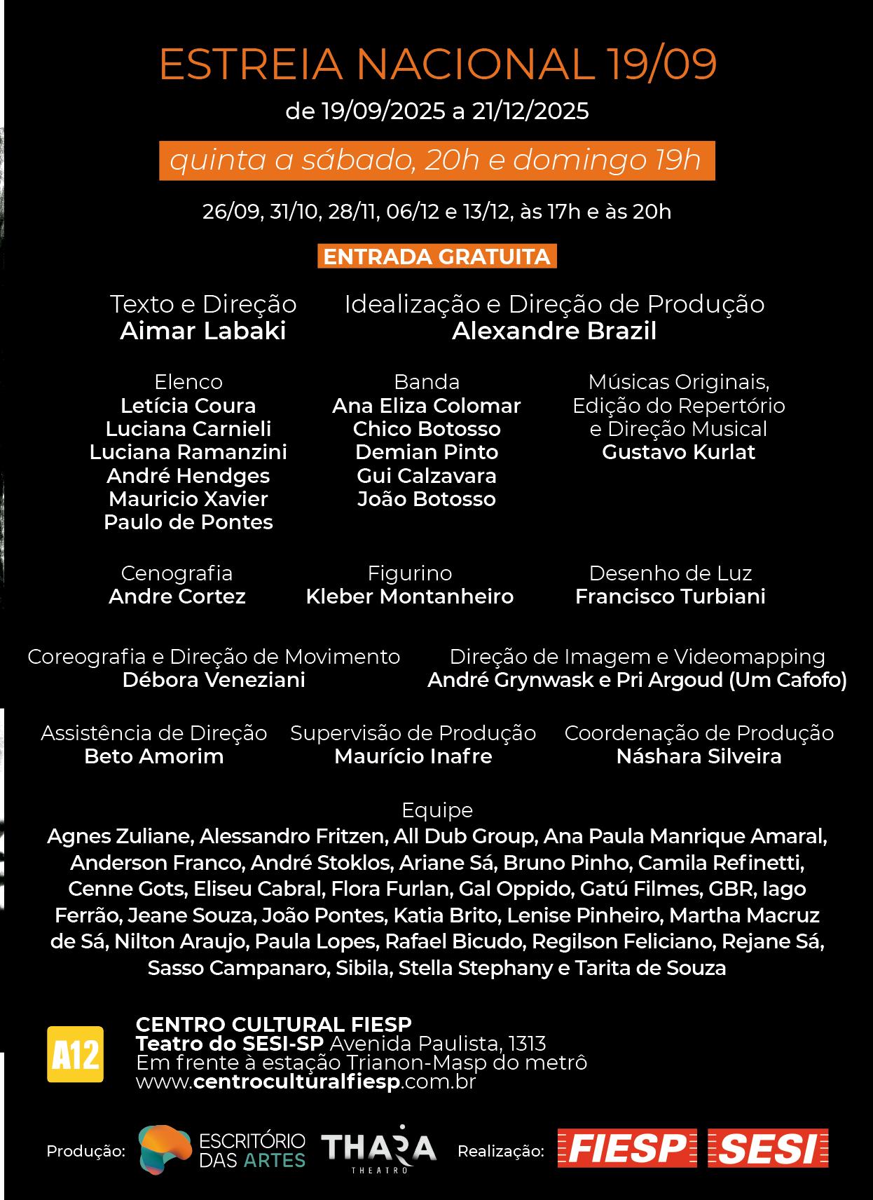 Nunes. Texto: Patrícia Andrade e Rodrigo França. Elenco: Aline Deluna, Alexandre Mitre, Douglas Netto, Eline Porto, Ester Freitas, Erika Affonso, Gab Lara, Marcela Rodrigues, Milton Filho, Raphael Elias, Tom Karabachian e Walerie Gondim. Direção: João Fonseca. Direção Musical: João Viana e Fernando Nunes. Coreografias: Marcia Rubin. Teatro Sabesp Frei Caneca - R. Frei Caneca, 569. Consolação. Sábado, 16h e 20h; domingo, 15h e 19h. A partir de R$21. 120min. 12 anos.