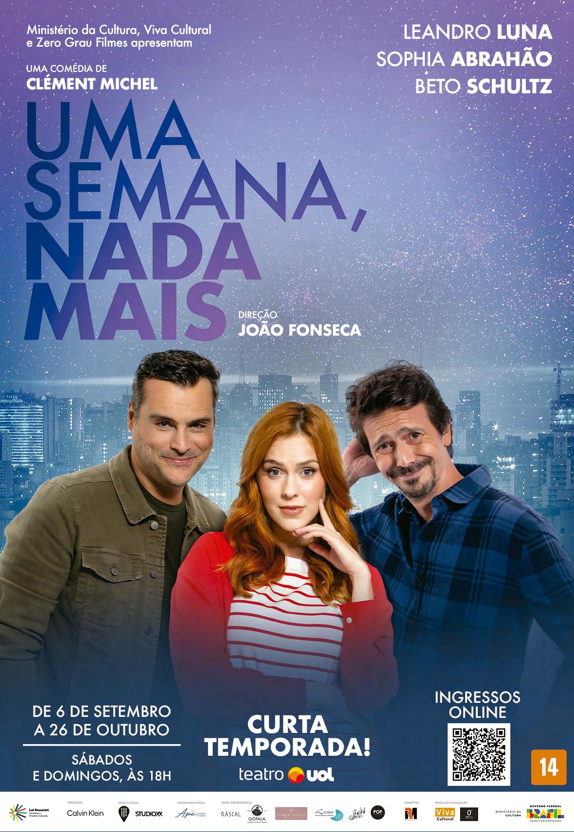 desestabilizar a relação para provocar o fim do namoro. O plano se estende por uma semana, tempo suficiente para expor fragilidades, egoísmos e contradições dos três personagens. Texto: Clément Michel. Elenco: Sophia Abrahão, Leandro Luna e Beto Schultz. Direção: João Fonseca. Teatro UOL - Av. Higienópolis, 618. Consolação. T. 3823.2323. Sábado e domingo, 18h. R$100. 70min. 14 anos. Estreia 06/09.