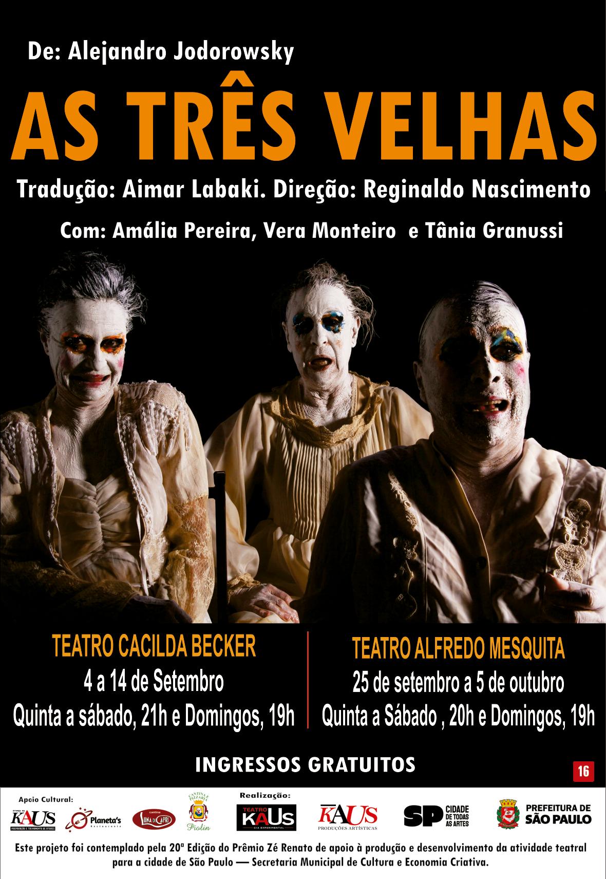 As gêmeas octogenárias Meliza e Grazia, duas marquesas decadentes, vivem em uma mansão em ruínas. Devastadas pela fome e pelo abandono, são sempre vigiadas pela centenária criada Garga. Em uma noite incomum, as três mulheres vivem revelações chocantes que desenterram segredos profundos e conduzem a trama por caminhos inesperados. Texto: Alejandro Jodorowsky.Tradução: Aimar Labaki. Elenco: Amália Pereira, Tânia Granussi e Vera Monteiro. Direção: Reginaldo Nascimento. De 04 a 14/09, quinta a sábado, 21h; domingo, 19h - Teatro Cacilda Becker - R. Tito, 295. Lapa. T. 11 3864.4513. A partir de 25/09, quinta a sábado, 20h; domingo, 19h - Teatro Alfredo Mesquita - Av. Santos Dumont, 1770. Santana. T. 11 2221.3657. Gratuito (retirar ingressos com 1h antes na bilheteria). 70min. 16 anos.