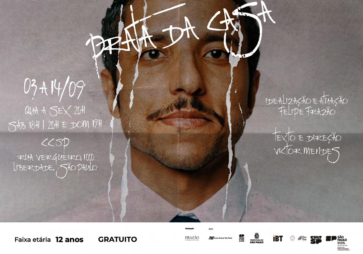 Um zelador de um antigo edifício que enfrenta uma grande transformação. A chegada das câmeras e da tecnologia de reconhecimento facial ameaçam seu emprego, sua moradia e a forte ligação com a escola de samba que faz parte de sua vida desde a infância. Além de herdar o emprego do pai, o zelador também herda sua paixão pelo samba, que o guia pelos desafios. Dramaturgia e direção: Victor Mendes. Idealização e atuação: Felipe Frazão. Centro Cultural São Paulo / Espaço Cênico Ademar Guerra - R. Vergueiro, 1000. Liberdade. T. 3397.4002. Quarta, quinta e sexta, 20h; sábado, 18h e 20h; domingo, 19h. Gratuito (retirar ingressos com 1h antes na bilheteria). 75min. 12 anos. De 03 a 14/09.