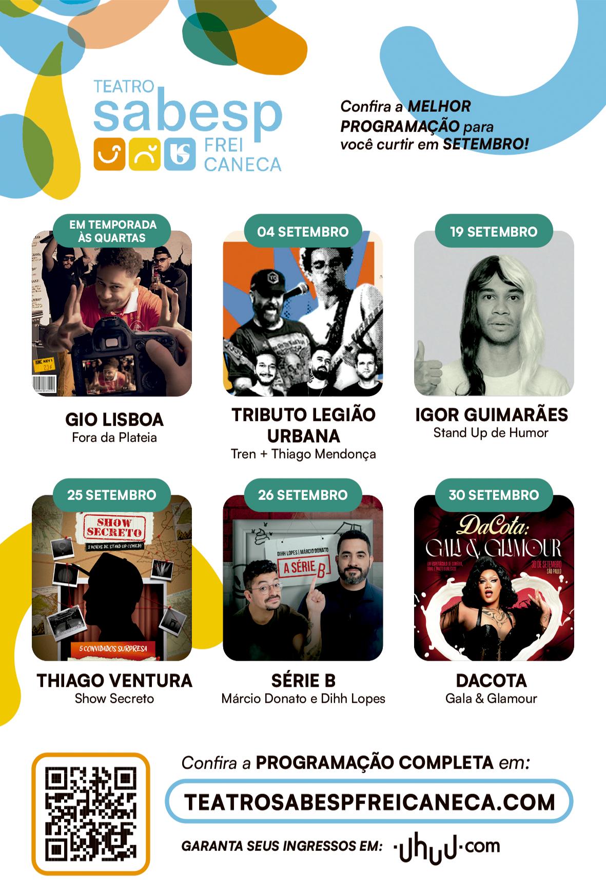 Espetáculo dinâmico, que combina a autenticidade do humorista com a participação de convidados surpresa. O comediante transforma o cotidiano em uma sequência de piadas afiadas e situações hilárias. Elenco: Thiago Ventura. Teatro Sabesp Frei CanecaShopping Frei Caneca - R. Frei Caneca, 569. Consolação. Dia 25/09, 20h30. A partir de R$190. 130min. 16 anos.