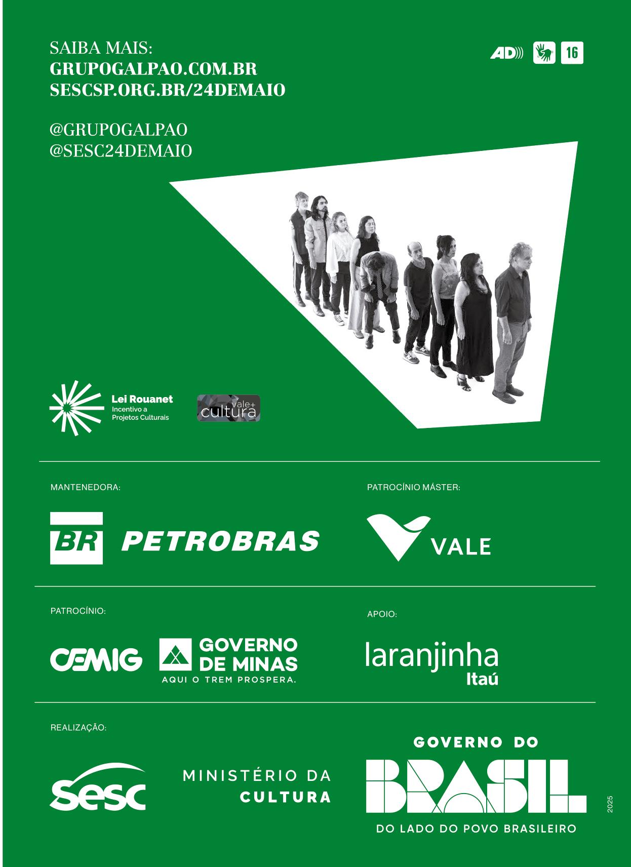 Uma epidemia de cegueira assola a cidade, privando seus habitantes de enxergar o mundo como antes. Tudo começa com um homem no trânsito, repentinamente cego. Rapidamente a condição se espalha e coloca à prova a moral, a ética e as noções de coletivo. Um encontro entre o Grupo Galpão e a obra de José Saramago, escritor português ganhador do Prêmio Nobel de Literatura. O espetáculo também conta com o “Ingresso Experiência”, categoria na qual o público poderá vivenciar vedadas a peça nesta experiência imersiva e sensorial no palco, guiada pelo elenco. Com: Grupo Galpão. Dramaturgia e direção: Rodrigo Portella. Elenco: Antonio Edson, Arildo de Barros, Beto Franco, Chico Pelúcio, Eduardo Moreira, Fernanda Vianna, Inês Peixoto, Júlio Maciel, Lydia Del Picchia, Paulo André, Simone Ordones e Teuda Bara. Sesc 24 de Maio / Teatro - R. 24 de Maio, 109. República. T. 3350.6300. Quinta a sábado, 19h; domingo e