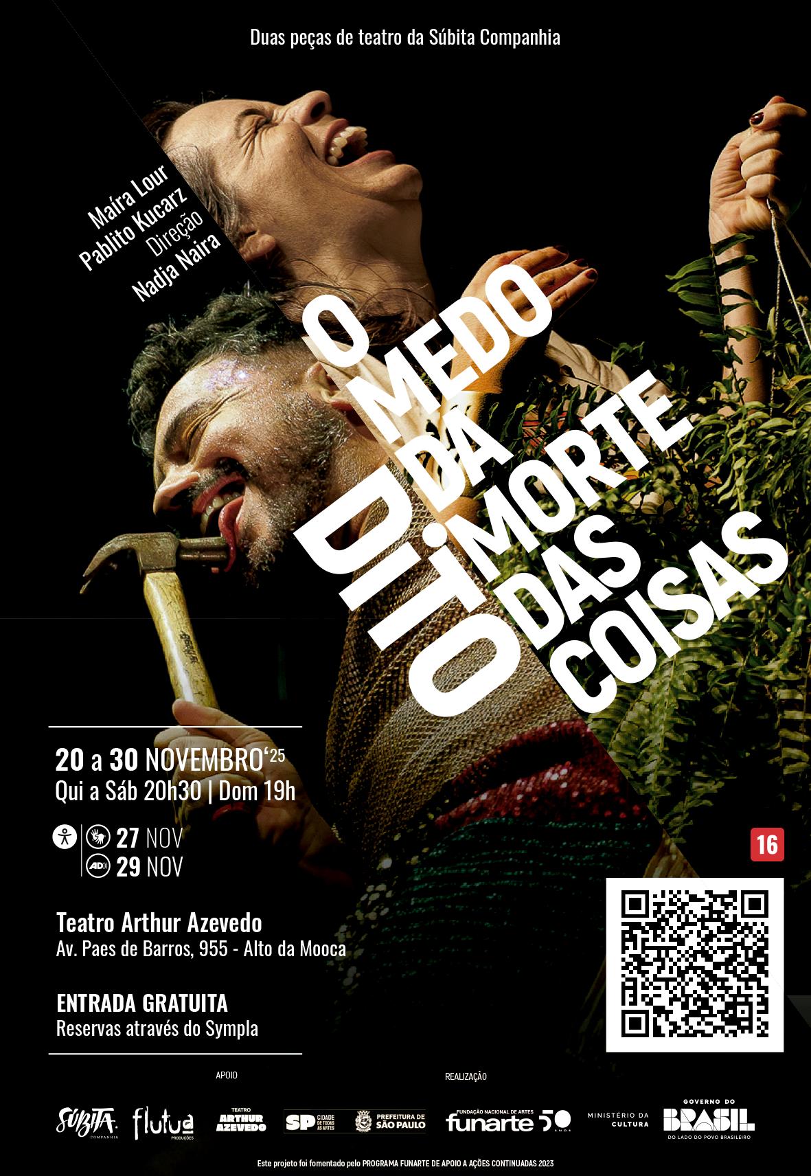 Da Súbita Companhia de Teatro. Direção: Nadja Naira. Teatro Arthur Azevedo - Av. Paes de Barros, 955. Alto da Mooca. T. 2604.5558. Quinta a sábado, 20h30; domingo, 19h. Gratuito (reserva www.sympla.com.br/evento/ dito-o-medo-da-morte-das-coisas-dasubita-companhia/3171528). De 20 a 30/11. 16 anos. Os espetáculos serão apresentados em sequência.
